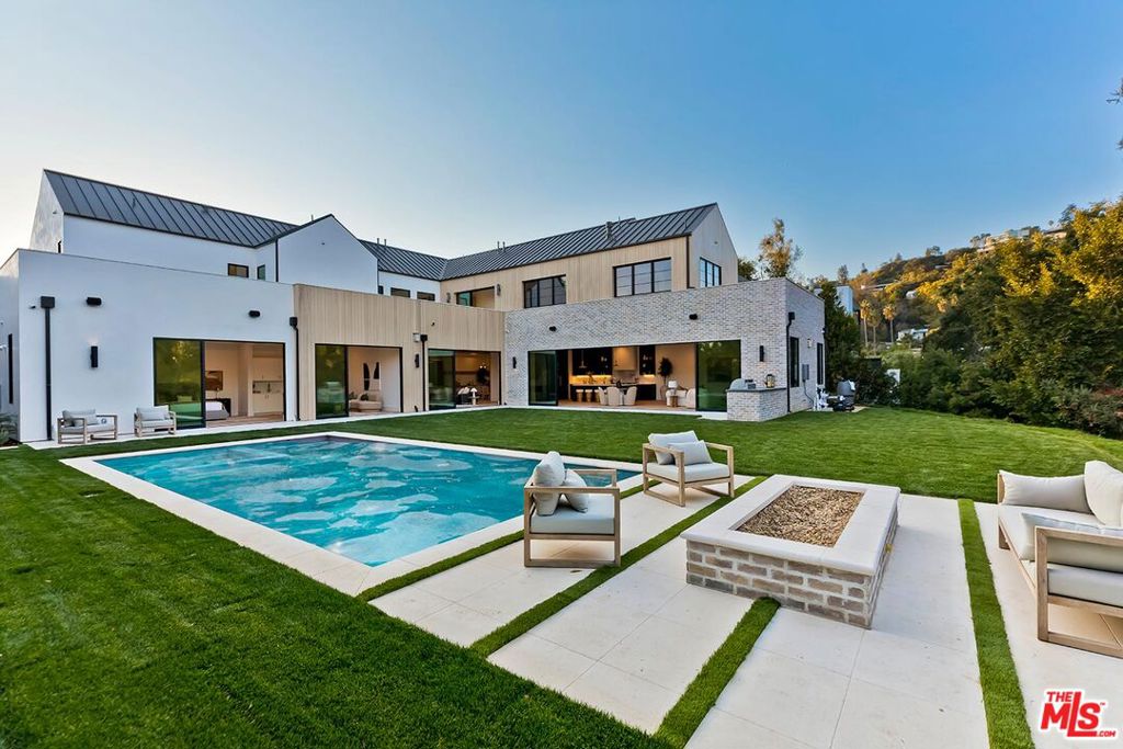 In the heart of the prestigious lower Beverly Hills Post Office area, this brand new construction Modern Farmhouse redefines luxury and sophistication. Set on an expansive flat lot of 14,000 square feet, the residence exudes timeless elegance with a warm contemporary design that invites natural light and nature into every corner. Boasting 5 bedrooms and 5.5 baths, this stunning home perfectly blends upscale amenities with serene, open interiors designed for both entertaining and everyday living. Step through the two-story entry into a light-filled oasis where organic materials like bleached wood siding, white oak floors, and vaulted ceilings create an atmosphere of tranquility. The thoughtfully designed floor plan seamlessly flows from living and dining rooms to an expansive great room with retractable walls of steel and glass opening to a resort-style backyard. Beautiful chef’s kitchen with butler’s pantry and extraordinary Argento Marble center island. Primary suite aerie with vaulted ceilings, spacious closets, and private terrace. Primary bath with handsome Grigio honed stone adorning shower, vanities, and fireplace. Three additional bedroom suites up and practical 2nd floor laundry. Main level stylish bedroom suite ADU opens to sparkling pool, BBQ for dining alfresco, and spacious, grass lawn. Captain of Industry office through architectural reeded steel doors. Dedicated first floor gym. Control 4 home automation. Located moments from the finest Beverly Hills, Westside, and Southern California amenities, this extraordinary estate offers a rare opportunity to experience unparalleled luxury and privacy in a warm, serene setting.