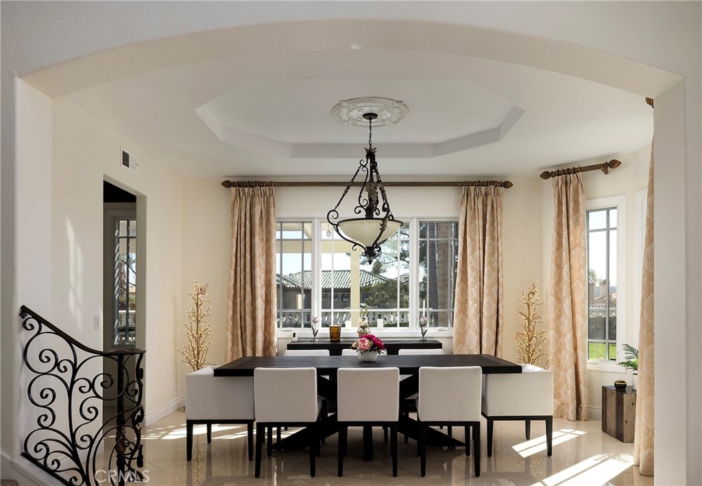 Behind the gates of The Estates at Rancho Niguel, 14 San Rafael is a commanding corner-lot residence defined by architectural scale, refined detailing, and elevated coastal living. Encompassing approximately 3,403 sqft, this four-bedroom, three-bathroom estate blends grand proportions with livability in one of Laguna Niguel’s most established gated communities. A dramatic double-door entry opens to soaring two-story ceilings, formal living and dining rooms, and a sweeping wrought-iron staircase that sets the tone for the home’s craftsmanship. Marble flooring, crown molding, custom millwork, and a built-in wet bar create an elegant and inviting atmosphere. The family room, anchored by a fireplace and wired for sound, flows seamlessly into the kitchen, forming the heart of the home. The kitchen reflects European influence and enduring quality, appointed with custom cabinetry, marble countertops, a farmhouse sink, center island, walk-in pantry, and professional-grade appliances including a Wolf range and Sub-Zero refrigerator. A breakfast nook framed by French doors opens to the backyard, extending everyday living outdoors. A main-level bedroom and full bath provide flexibility for guests or multigenerational living. Upstairs, the primary suite offers impressive volume, its own fireplace, and access to a private balcony capturing hillside views. The primary bath evokes a spa experience with marble dual vanity, a custom-tiled walk-in shower, a jetted tub, and dual walk-in closets. The backyard is composed for privacy and presence, wrapped in balustrade walls and enhanced by landscape lighting. Covered and open seating areas allow for effortless entertaining beneath mature palms and open skies. The residence reflects meticulous care and investment, including windows, A/C system, front door and patio doors, Cove dishwasher, and landscaping drip system, along with a prior full re-pipe — offering aesthetic refinement and meaningful system upgrades. A three-car garage with epoxy flooring and built-in cabinetry completes the property with scale and polish. Residents enjoy exclusive access to The Club at Rancho Niguel, offering lighted tennis courts, heated lap pools, spa, gym, volleyball and basketball courts, clubhouse facilities, and community programming. Beaches, resorts, championship golf, premier dining, and highly regarded schools are nearby. A refined estate within a gated enclave designed for those who value space, privacy, and enduring quality.