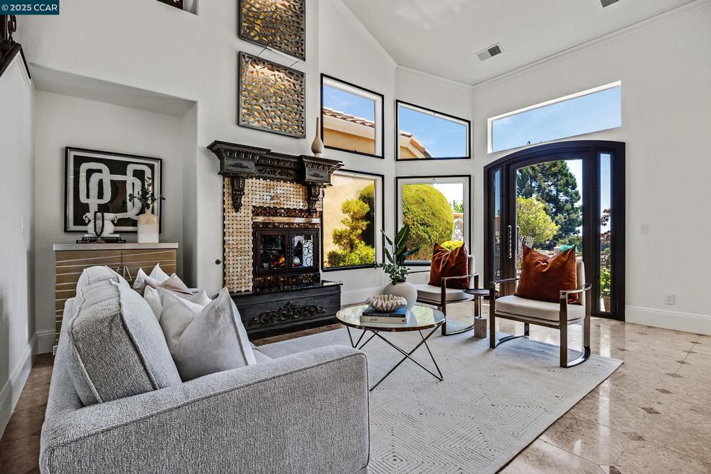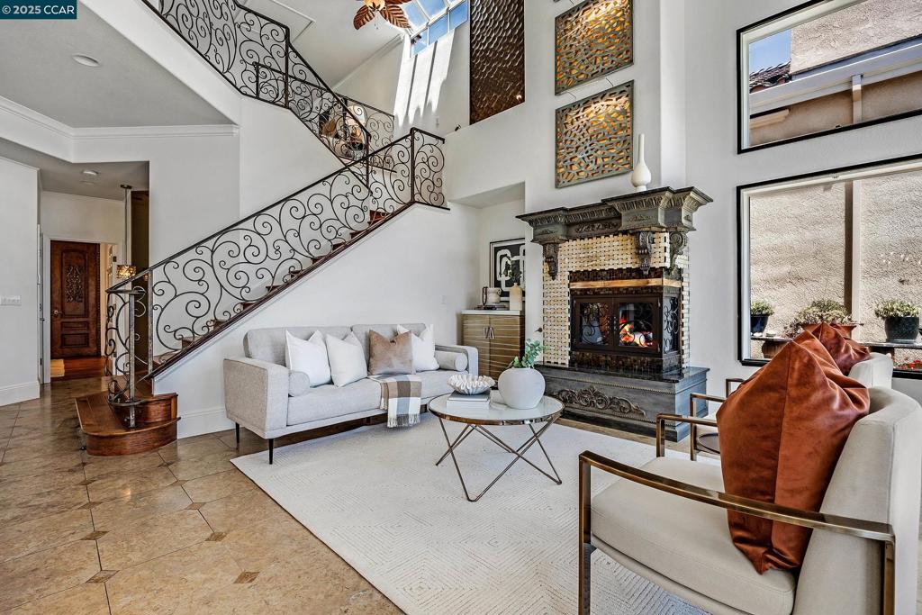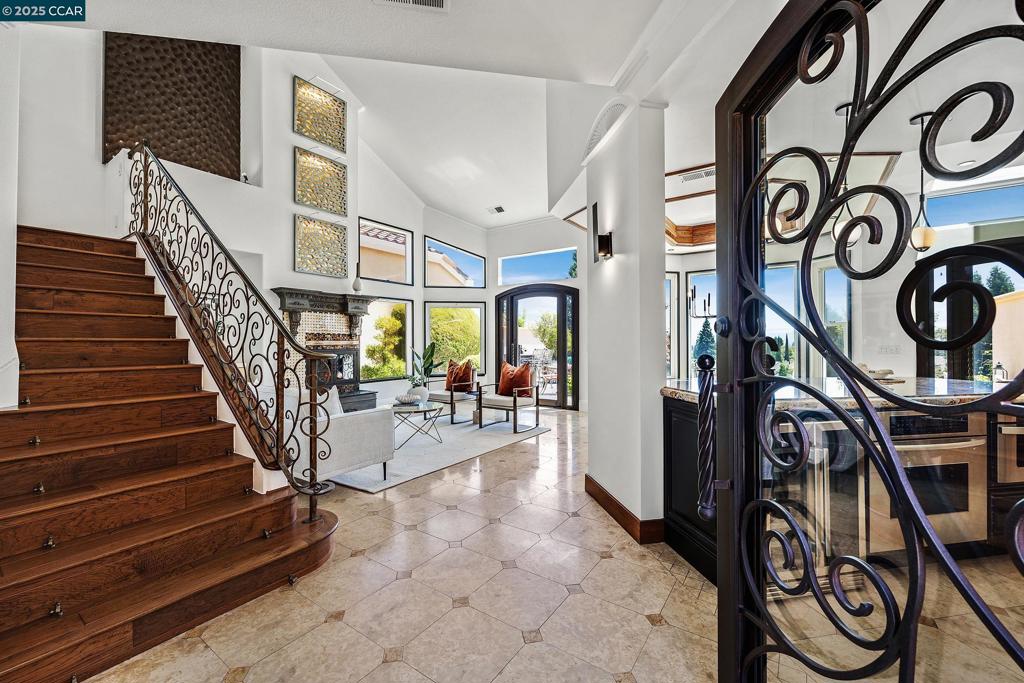 Welcome to paradise! This sophisticated Mediterranean-style residence offers breathtaking golf course views with sweeping rolling hills all while delivering upscale finishes and a truly luxurious lifestyle. Inside, you’ll find stunning details throughout—from the custom wrought iron doors to the intricate tilework on the fireplace, showcasing true pride of ownership. The gourmet kitchen is a standout, featuring custom cabinetry, a Viking range, a Sub-Zero fridge, and Thermador oven—perfect for entertaining or enjoying a quiet night in. The main level also includes a full bedroom and bathroom, ideal for guests or multi-generational living. Relax and unwind in the steam shower downstairs or retreat to the spa-inspired primary suite upstairs, complete with a custom fireplace, jacuzzi tub, walk-in closet and serene views. Step outside to gaze at the view or enjoy multiple seating and dining areas, a tranquil fountain, and lush potted plants—all designed for low-maintenance enjoyment. The community features a resort-style pool and a secure, gated entrance for added peace of mind. Minutes from City Center, Whole Foods, Target and with easy access to 680, this home is as convenient as it is luxurious. If you’ve been searching for elegant, resort-inspired living in San Ramon, this is it!