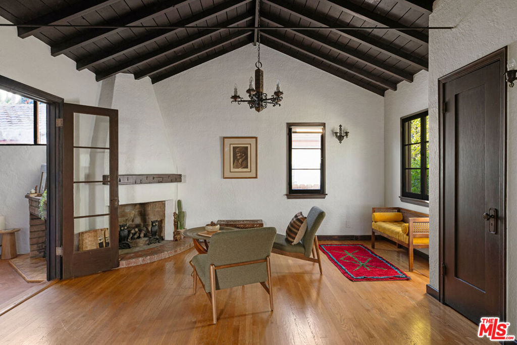 Tucked away from the street in prime Eagle Rock, this handsome Spanish is a study in period charm. The interior is stunning: golden light reflected in wood floors, a soaring beamed ceiling, and a stately fireplace anchoring the spacious living and dining areas. The adjacent library features elegant built-ins and one more fireplace. The kitchen and pantry maintain the period feel with white cabinetry, and there is a cozy breakfast nook. Three bedrooms include a primary wrapped with windows; the bathroom channels a vintage spirit, and the bonus room with a separate entrance is perfect for an office or guests.The outdoor spaces are magical: a terraced backyard with patios to lounge and enjoy sunset views, plus a front patio set beneath lush foliage. Amenities include central AC/Heat, laundry, and parking. Well-situated within the coveted Dahlia Heights Elementary boundary, you’re moments from Capri Club, Little Beast, Cindy’s, and the rest of NELA favorites.