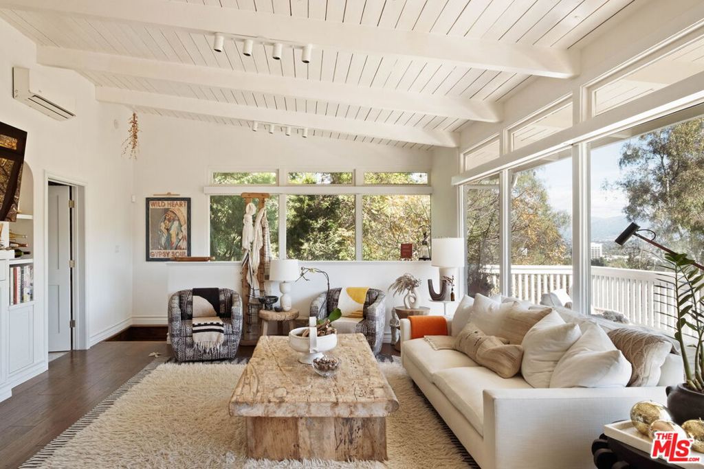 Secluded modern retreat perched among the trees with sweeping canyon, mountain, and city light views. Step through the dramatic A-frame atrium into a light-filled sanctuary that feels miles from the city yet remains moments from everything. This 3-bed, 3-bath mid-century inspired home features soaring vaulted ceilings with exposed beams and floor-to-ceiling glass that frames nature and skyline in equal measure. The open main level flows seamlessly to an expansive balcony, ideal for morning coffee overlooking the canopy or evening entertaining under the stars. The primary suite opens directly to these same views and outdoor space. Lush, mature landscaping surrounds the home, with a private walking trail just beyond and only one neighboring property, creating rare privacy and tranquility. Downstairs, a versatile family room and two additional bedrooms offer flexible living options. Multiple level outdoor areas provide space to garden, play, or simply breathe. A rare find in Sherman Oaks: privacy, views, and natural beauty without compromise.