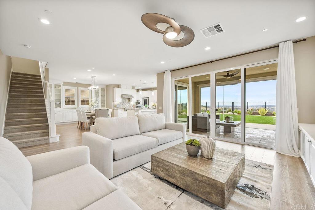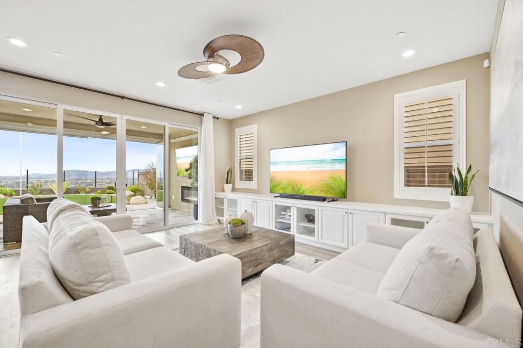 BREATHTAKING VIEWS! Welcome to 15894 Anjou Lane, a stunning residence located in the prestigious community of Heritage Bluffs. This remarkable Corzano Plan 3 home is the perfect blend of sophistication and modern living, offering an open concept layout with a main floor bedroom, full bathroom and dedicated home office space, luxurious finishes throughout the home, and unparalleled panoramic views. The heart of the home is the bright and airy kitchen, showcasing sleek white cabinetry, a custom stone backsplash, and a spacious island with plenty of storage. Outfitted with top-of-the-line KitchenAid commercial-grade stainless steel appliances and a walk-in pantry, this kitchen is as functional as it is beautiful. Just steps away, the dining room is an entertainer’s dream, featuring custom built-ins that double as a buffet for effortless hosting. The primary suite is a serene retreat, designed to maximize both comfort and style. The expansive bedroom is filled with natural light thanks to oversized windows that frame the valley’s stunning views. The spa-like bathroom with stunning marble floors includes dual vanities, built-in cabinetry, a jetted jacuzzi bathtub, and a separate shower with exquisite custom stone detailing and rainfall showerheads. A large walk-in closet completes the space, offering practicality without compromising on elegance. The upstairs loft offers a versatile space, ideal for a playroom, TV area, additional home office, or creative retreat. Throughout the home, you’ll find thoughtful upgrades that elevate the living experience. From insulated walls and ceilings for added comfort and efficiency to builder-installed upgraded flooring, window casings, and modern countertops, every detail has been carefully considered. The property also boasts a Tesla 5.6KW solar system with a Powerwall, providing reliable energy for the entire household. Step outside to your private backyard oasis. The custom-enclosed California Room, complete with a fireplace, invites year-round relaxation. The outdoor space features lush grass, drought-tolerant landscaping, and a custom firepit that adds ambiance for those cozy evenings under the stars. All of this is set against the backdrop of unobstructed Black Mountain views that seem to stretch forever. Homeowners enjoy inclusion in the acclaimed Poway Unified School District. Heritage Bluffs is a highly sought-after area that’s within 5 miles of 72 restaurants and is less than 1 mile from grocery stores, gyms, and other shops! Enjoy the beautiful Southern California weather with 27 golf courses, 19 parks, and 4 hiking reserves all within 10 miles! Within walking distance to the award-winning Poway Unified Oak Valley Middle School. It is also a short distance to Stone Ranch Elementary, Design 39 Campus and Del Norte High School. You can’t beat this location just a quick few minutes’ drive to the I15 and CA-56 freeways! Don’t miss the opportunity to make this exceptional home your own. With its impeccable design, luxurious finishes, and prime location, this home truly represents the epitome of refined living.