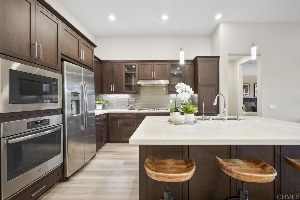 Discover refined, resort-style living at Avante, Del Sur’s premier 55+ gated community! This Plan 3 is 2 levels with an in-unit elevator, making it feel like a single level. This beautiful home offers an inviting atmosphere and features soaring 11’ ceilings in the spacious open-concept living area, 2 large private bedrooms, 2.5 bathrooms, a secluded patio and balcony, and large windows that let in an abundance of natural light. The state-of-the-art chef’s kitchen boasts espresso cabinets, white quartz countertops, a full tile backsplash, stainless steel appliances, and a large island. Throughout the kitchen and bathrooms, custom pull-out drawers make all storage spaces easily accessible and useful! The primary suite is a serene escape complete with a walk-in closet, en-suite bathroom with wheelchair access, dual sinks, and shower. The second primary bedroom is versatile, equipped with a Murphy bed, making it ideal for use as a guest room or office, and provides access to a well-appointed second full bathroom. Additional conveniences include a large laundry room and an attached 2-car garage. Avante residents enjoy amenities such as a clubhouse, pool, spa, gym, grill, outdoor seating areas, and a curated activity and social calendar. This home is just 3 doors down from the clubhouse and pool, making it a short walk to all the amenities and the outdoor grill. Positioned near dog parks, hiking and biking trails, equestrian paths, and Black Mountain Open Space Park, this location is a short drive to beautiful beaches and 15 golf courses within a 20-minute radius. Enjoy the benefits of buying a property within the award-winning master-planned community of Del Sur, with 14 parks, extensive hiking trails, year-round community events, and convenient shopping. Within walking distance to the Del Sur town center, featuring Sprouts Farmers Market, Target, Starbucks, restaurants, fitness clubs, and more, this is the epitome of upscale living.