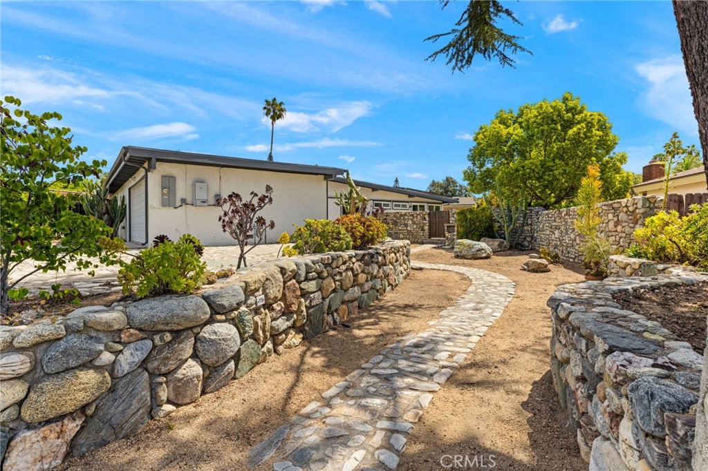 Stunning Contemporary home with Magnificent Ceilings and Beautiful Hand Restored Beams, set on a Very Large Lot. Several outer Structures complete this truly unique property. Sunlight fills the rooms of this home and creates a warm and inviting atmosphere. New Electrical wiring, LED & Recessed lighting, NEST Heat & Air, new ducts, Newer Roof, 3.5 KW Solar panels all paid no lease, windows, New beautiful, remodeled bathrooms. Skylights in many rooms. The property invites imagination, a canvas ready for floorings, paint etc. It is a tranquil sanctuary surrounded by nature. Amazing rock walls and rock features that surround the property. Two car garage that could possibly accommodate 3 cars or a large workshop. Space is there and ready for a dream kitchen. So many windows and views from all into private outdoor spaces. Two outside structures, one another workshop or storage. The other could be possibly completed as a ADU or extra office. Many Fruit trees, Pomegranate, Lemon, Grapefruit and Prickly Pear. Very close to Elementary school and Claremont Colleges. So many possibilities!