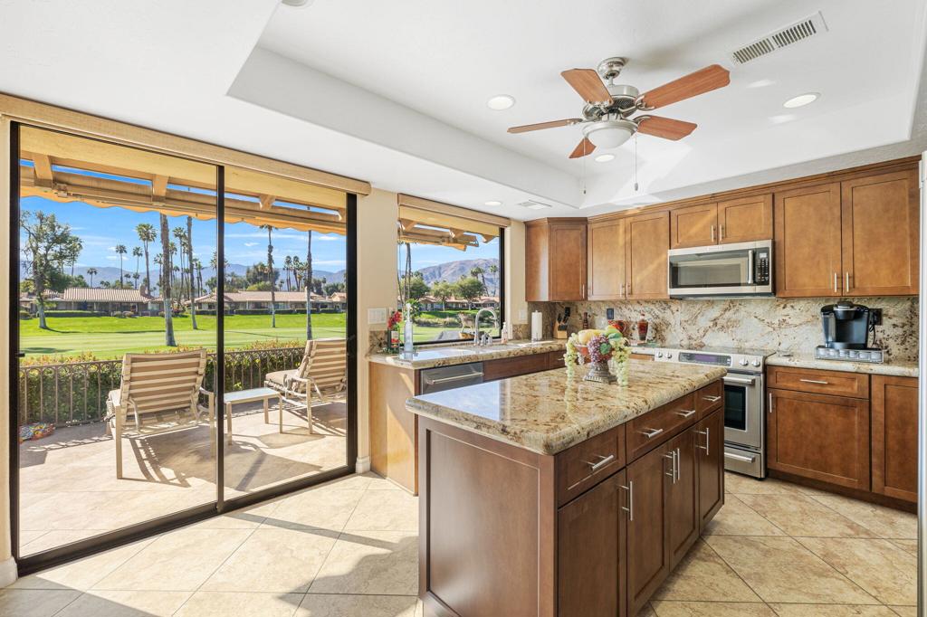 Location, Location! Fabulous fairway, water and expansive mountain VIEWS from the patio of this REMODELED, SOUTH facing, 3000 Plan. 2220SF, 2BD+Den+Office/2.5BA, with the Den being used as a 3rd bedroom. Professional, custom finishes throughout. Kitchen remodel features beautiful cabinetry & hardware, granite counters & backsplash, center island, and stainless appliances. Kitchen wall has been removed, adding a breakfast bar, additional counter space and a seamless flow into the living area. Designer tile flooring & paint, tiled gas fireplace, ceiling fans, recessed lighting, custom window coverings, and energy efficient exterior windows & sliders. Atrium conversion is now a spacious office with 2 additional closets. Wonderful cabinetry, tile, lighting & hardware in remodeled baths too. Back patio includes power awnings off the kitchen & living room and is perfect for enjoying the desert sun, amazing views, and entertaining family & friends. Large 2-car garage with additional storage. New water heater just installed March 2026! 27 holes of Ted Robinson designed golf, sports center with tennis, fitness, pickleball and bocce courts, and 37 pools for your enjoyment. Centrally located in the heart of Palm Desert, Monterey CC is one of the most active clubs in the desert. Offered designer furnished per inventory.
