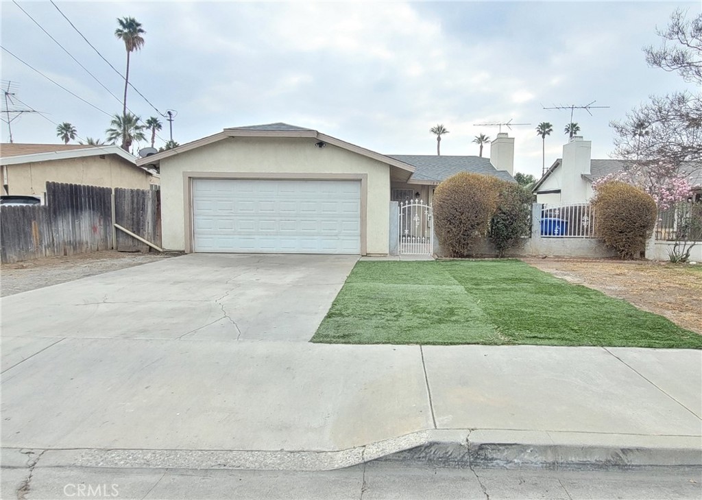 Nice single house 3 bedrooms 2 full bathrooms (including 1 master suite) total living area 1,102 sqft (public records) built in 1991. Large backyard good for planting. Cozy living room with cathedral ceiling and fireplace. Spacious kitchen with pantry and granite counter top. Bright and airy dining area off gourmet kitchen. Split air-conditioner and heater for each bedroom and living room. Tile floor in all bathrooms and kitchen. Wall to wall carpeting in all bedrooms, living room and hallway. 2 car attached garage with automatic door opener and laundry hookup. Desirable location close to shopping center and easy access to University of California Riverside or downtown Riverside. Property sold as is condition.