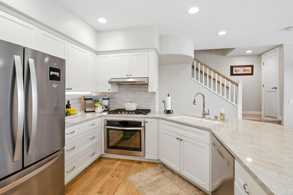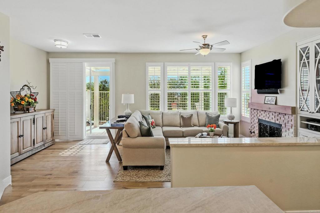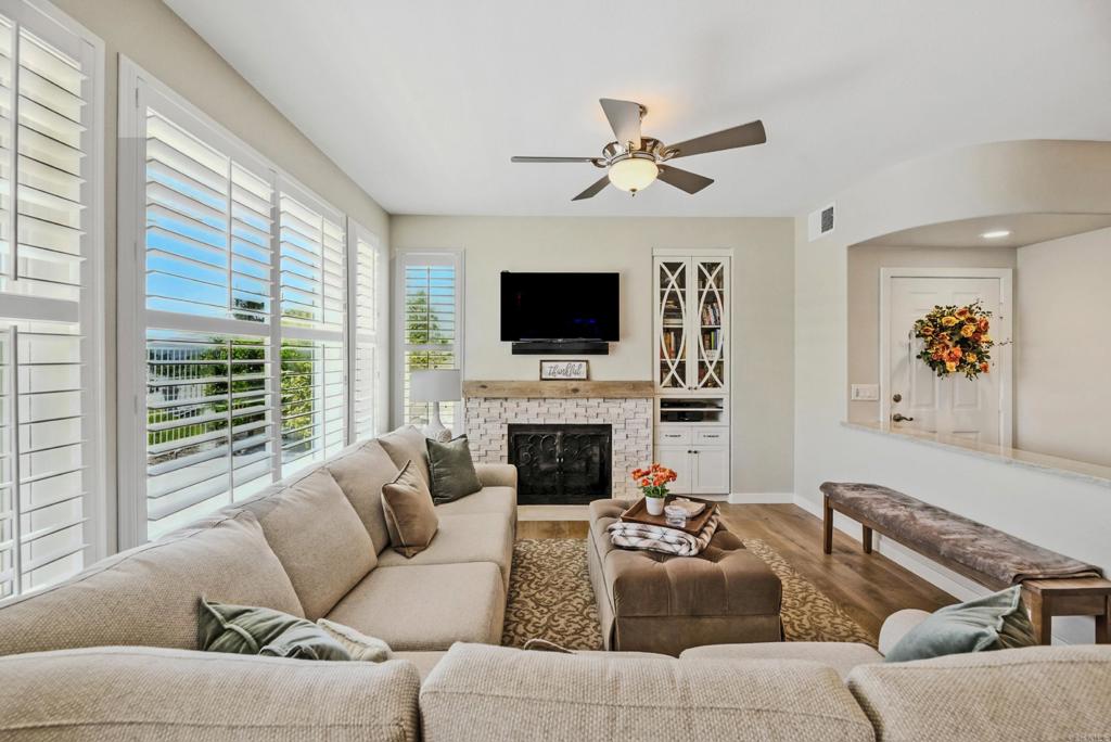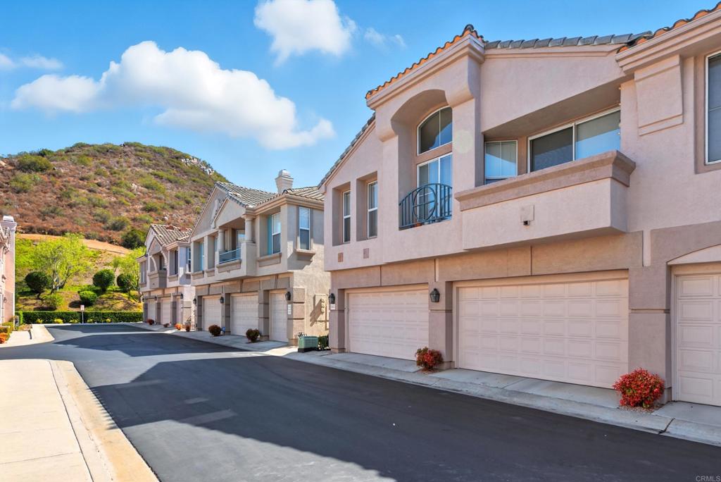 DISCOVER THE BEAUTY BEHIND THE GATES OF VISTA DEL LAGO! Highly upgraded townhome with panoramic mountain and sunset views. Upon arriving you will notice the extra space between this building and the neighbor providing privacy and a larger than most backyard updated with stamped concrete, roses, fruit trees, an aluminum patio cover and newer vinyl fencing. Design winning floorplan when built by DR Horton for its spacious/open design. Remodeled kitchen has all newer cabinetry and plenty of soft close drawers and soft close doors with polished nickel hardware topped with gleaming quartzite countertops and shiny subway tile, stainless steel Whirlpool 5 burner gas stove, oven, French door refrigerator, Bosch dishwasher, large farm sink with polished nickel faucet and informal dining area, polished nickel light fixture and updated canned lighting opening to a large great room with engineered wood flooring throughout featuring a gas fireplace with custom screen doors, stone jigsaw piece effect facing enhanced by a wood mantle matching the floors. Entire home has newer, dual paned windows solid wood interior doors and plantation shutters. Upstairs are dual primary suites-one with a panoramic view has an amazing updated tile walk in shower and raised dual vanity with quartz countertops, newer cabinetry and polished nickel hardware, a custom fan outside the shower and walk in closet. Linen cabinets are in the hall between this and other bedroom suite with its own full bath and large closet. The two car garage opens into the laundry room with side-by-side washer/dryer and custom cabinetry above. Located in the highly acclaimed Poway Unified School district this multi million dollar recreation center facility features 2 pools (one a heated lap), 2 spas, exercise room, 4 lighted tennis/pickleball courts, banquet room and more! LOW HOA and NO MELLO ROOS.