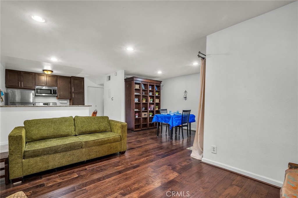 Stylish Studio Condo – A Smart Alternative to Renting! Why rent when you can own this bright and inviting studio condo and start building equity! Step into an open, light-filled living room featuring gorgeous, engineered wood flooring, smooth ceilings, and recessed lighting—perfect for modern living. The versatile layout includes a cleverly designed Murphy bed disguised as a built-in bookshelf, seamlessly combining living and sleeping areas. The kitchen is a cook’s delight with granite countertops, stainless steel appliances, and rich cabinetry. A cozy desk nook and a spacious hall closet provide ample workspace and storage. The bathroom boasts a large vanity and a convenient tub/shower combo. Enjoy your private patio with serene views of the beautifully maintained grounds and sparkling pool. Additional highlights include all appliances, furnishings, central air conditioning, and two assigned tandem parking spaces! The community offers resort-style amenities, including a pool, spa, gymnasium, sauna, clubhouse with a kitchen and pool table, outdoor bar-be-cuing, tranquil water features, and lush landscaping. Low HOA dues of $395 include all the amenities plus Earthquake Insurance, Gas, Water, Sewer, and Trash! Conveniently located near shopping, entertainment, places of worship, public transportation, and more, this condo delivers an unbeatable lifestyle. Don’t miss this opportunity—schedule your showing today. This gem won’t last long!