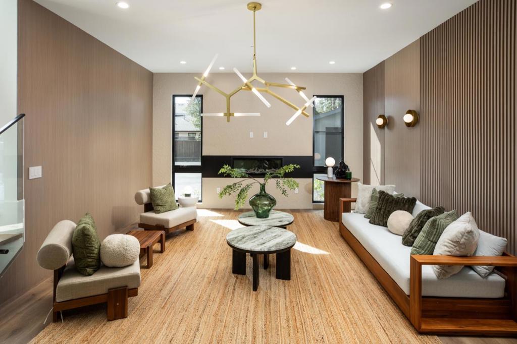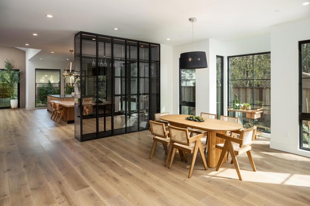 Striking new construction residence blends clean architectural lines with organic warmth and a refined, natural palette. Set back behind a long gated driveway, the home is filled with natural light and expansive walls of glass and custom lighting. Public spaces flow seamlessly, beginning with a formal living room featuring and an elevated linear fireplace. The formal dining area and sleek open concept kitchen showcases concealed Gaggenau appliances, and Amarula marble with built in casual dining area. Impressive family room features a skylit vaulted ceiling, linear fireplace, and stacking glass doors to the rear deck, plus adjacent multi-use room and dedicated office. Upstairs, the tranquil primary suite offers a sitting area and refreshment bar, customized walk-in closet, and spa-inspired bath Three additional en-suite bedrooms continue the same elevated level of finish. An attached one-bedroom ADU (included in 5,110sq ft) with private entrance provides flexible options. The rear yard features an expansive deck, privacy hedges, and low-maintenance synthetic lawn. Additional highlights include white oak floors, detached two-car garage, solar power, programmable lighting, multi-zone climate control, in a convenient location near downtown, Stanford University, and top schools.