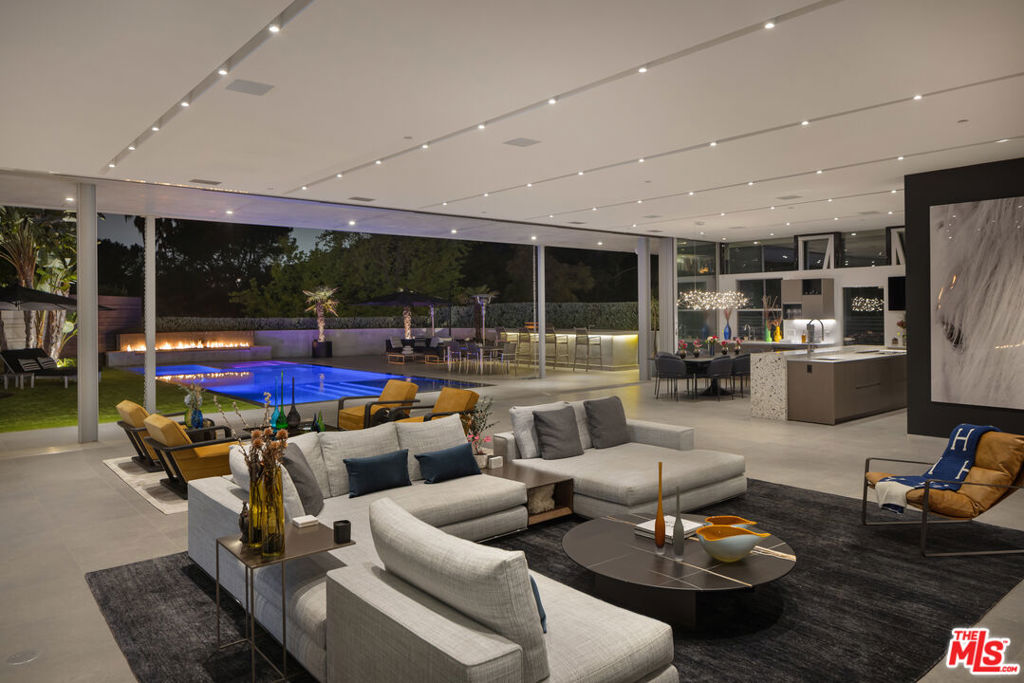 In the heart of prestigious Trousdale Estates, this remarkable residence reimagines resort living with the spirit of a private Balinese sanctuary. Set on an expansive 19,977-square-foot lot, the home unfolds as a zen-inspired contemporary marvel, where organic textures, voluminous proportions, and masterful craftsmanship converge. Upon arrival, a grand entryway leads to an elongated gallery, creating a striking prelude to the dramatic open floor plan beyond. Walls of glass wrap the living, dining, media, and kitchen spaces, blurring the boundary between interior and exterior with 100 feet of automated Fleetwood sliding panels. Sunlight floods every corner, enhancing the sense of openness and drawing focus to the high ceilings and carefully layered materials that give the home its rich, immersive warmth. The kitchen, designed by Porcelanosa and Miele, overlooks the outdoor living areas and transitions effortlessly to a fully appointed exterior kitchendesigned for elevated gatherings under the sky. The primary suite offers a private retreat within the retreat, anchored by a sculptural stone wall and fireplace, and opening to a secluded deck with its own fire feature overlooking the pond and expansive gardens. Every element of the landscape and architecture feels intentional, curated to create a continuous dialogue between nature and structure. As the glass walls glide away, the home spills into a Balinese-inspired oasis, where a zero-edge infinity pool appears to float into the interiors, and a large koi pond, framed by a cascading waterfall and fire pit, amplifies the atmosphere of tranquil luxury. With five bedrooms and six baths, the residence offers the rare combination of immersive privacy and proximity to world-class dining and shopping, just moments from the heart of Beverly Hills yet tucked into the serene elevation of Trousdale.
