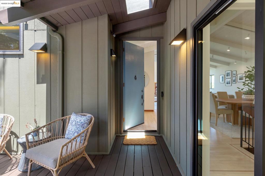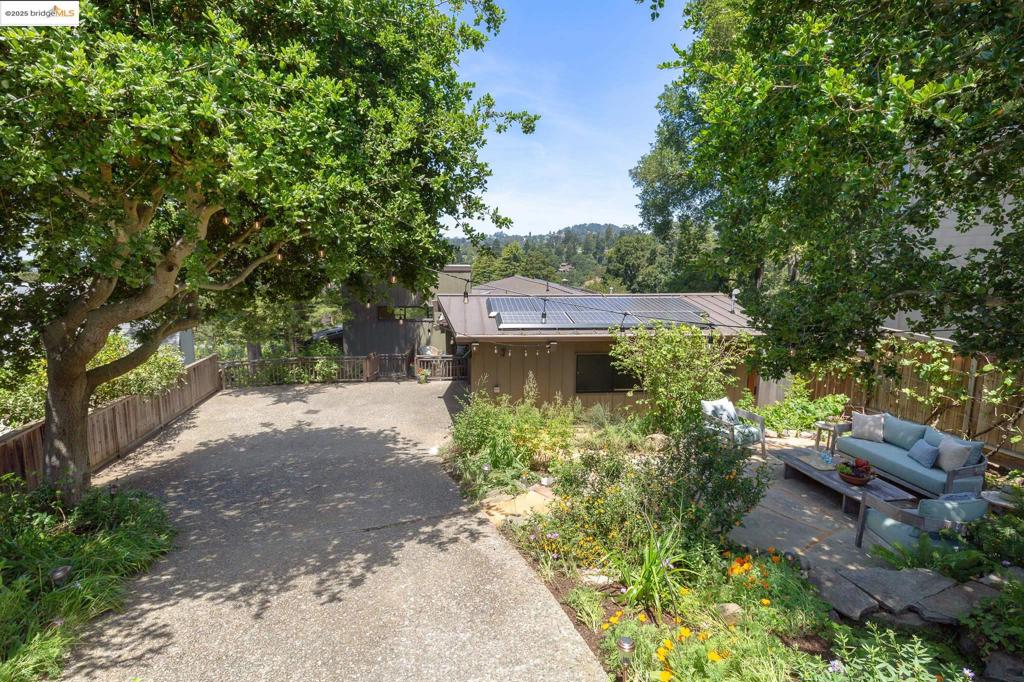 Tucked away at the end of a gated driveway, this stunning contemporary residence offers a serene escape surrounded by nature, with lush hillside views from nearly every window and glimpses of the San Francisco Bay. Set back from the street and enveloped in native gardens, this home is a rare blend of privacy and style. For the environmentally conscious, this fully electric home has a zero-carbon footprint. Equipped with solar panels, Tesla Powerwalls, EV charger outlet, high-efficiency heat pumps, and more, it offers smart, sustainable living with no compromise. Relaxation awaits in every corner—from a spa-like primary bathroom and private sauna to tranquil outdoor decks and patios perfect for meditation, reading, or soaking in the natural beauty. The open-concept main level is tailor-made for entertaining and everyday living. Vaulted ceilings and expansive windows flood the rooms with natural light. The updated chef’s kitchen, adjacent family room. half bath and 2-car garage complete the main floor. All 3 bedrooms and laundry are downstairs – the primary suite is a true getaway. Outdoor living is seamless with multiple decks and beautiful gardens. Adventure beckons with miles of nearby trails for hiking and biking. The Montclair Village awaits with its shops, cafes & park.