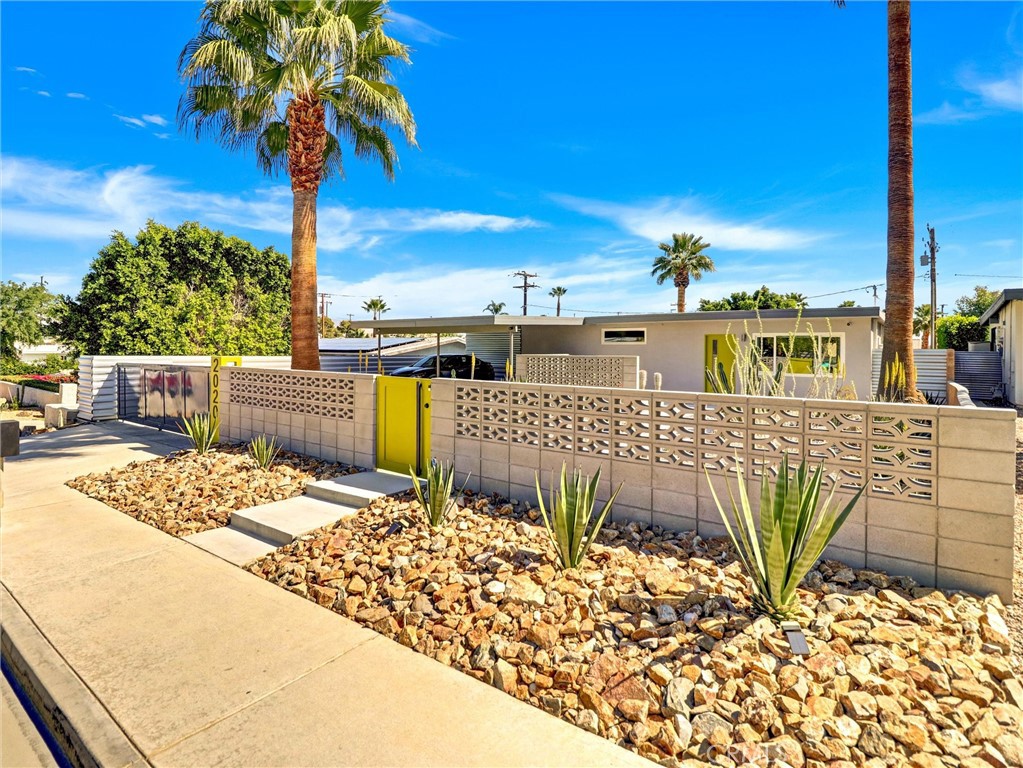 Welcome to 2020 Lawrence Street, a beautifully upgraded mid-century modern home in Palm Springs offering mountain views, thoughtful improvements, and the relaxed lifestyle the desert is known for. With no HOA and low taxes, the property sits just a short walk away from the Tahquitz Creek Golf Resort. Also a short distance from shopping, restaurants, and Palm Springs International Airport. The CV Link trail system is steps away, providing miles of pathways for biking, walking, and golf cart access across the Coachella Valley. The home’s outdoor spaces are designed for enjoying the desert climate year-round. The backyard features a Pebble Tec saltwater pool with waterfall and fountain features, custom lighting, shade sails, and a gas fire pit that creates a welcoming space for relaxing evenings or entertaining guests. Multiple seating areas and low-maintenance desert landscaping take advantage of the surrounding San Jacinto and Little San Bernardino Mountain views. Inside, the layout is open and bright with windows that bring in natural light and connect the indoor living areas to the outdoor spaces. Porcelain tile flooring runs throughout main living areas, and the kitchen features quartz countertops and modern finishes that complement the home’s architectural style. Both bedrooms include private bathrooms, offering comfort and privacy for residents or guests. A separate utility room with washer and dryer provides additional convenience. Numerous upgrades have been completed to improve efficiency and comfort, including energy-efficient windows, high quality insulation for heat reduction, new plumbing lines, and mini-split climate systems. The home also includes a new tankless water heater and a reflective roof designed to help reduce heat absorption and improve cooling efficiency. Additional features include covered and gated parking, guest parking, and a storage shed. With its combination of classic mid-century design, modern updates, and convenient location, this property offers an excellent opportunity for a full-time residence, second home, desert getaway or vacation rental/Airbnb (STR). Furniture may be available as an option, offering the potential for a turnkey Palm Springs retreat.