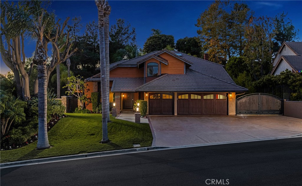 This exceptional estate home is set high in the hills of Yorba Linda and boasts one of the most incredible lot locations on this beautiful cul-de-sac street. The property provides the ultimate in privacy, serenity and outstanding panoramic city light views! Driving up, you’ll notice the sprawling, meticulously landscaped frontage with an oversized driveway, 3-car garage and two separate RV/storage areas, each paved and secured by Ghost Controlled automatic gates. Inside, the open and bright floorplan is enhanced by cathedral ceilings, glistening flooring and abundant upgraded windows and French doors, providing wonderful natural light and lush, private views. Enjoy breathtaking views from the formal living and dining rooms. French doors lead to a tranquil sitting area. The chef-quality kitchen features cherry cabinetry, soft closing drawers and built-in stainless appliances including a 6-burner Thermador gas range, GE Monogram refrigerator, dual ovens with convection and a microwave. The family room adjoins the kitchen and features an updated fireplace and French doors leading to the backyard and covered patio. The floorplan also features a convenient downstairs bedroom/office with modified closet and a bathroom with walk-in shower. The primary suite features an updated bath with a separate soaking tub and large shower, dual vanities and a walk-in wardrobe closet with custom built-ins. A sliding barn door offers a modern touch. Three additional bedrooms and another full, updated bathroom complete the upstairs. The largest secondary bedroom includes a finished attic space for extra walk-in storage or closet. Other indoor features include inside laundry, dual zone A/C and heating with Nest thermostats, recessed lighting, sky lights, ceiling fans and elegant wrought iron stair railings. The finished 3-car garage with epoxy floors, included TV and walls of built-in cabinets is sure to excite every car enthusiast. The backyard is a spectacular setting with multiple covered seating areas to enjoy the views, a large pool-sized grassy area, and a BBQ kitchen that includes a built-in grill, 2-burner stove top and wet sink. Students attend the highly desirable Travis Ranch K-8 and Yorba Linda High School. Enjoy a short stroll to nearby San Antonio Park and surrounding walking trails. Don’t miss the opportunity to experience this magnificent lifestyle home!