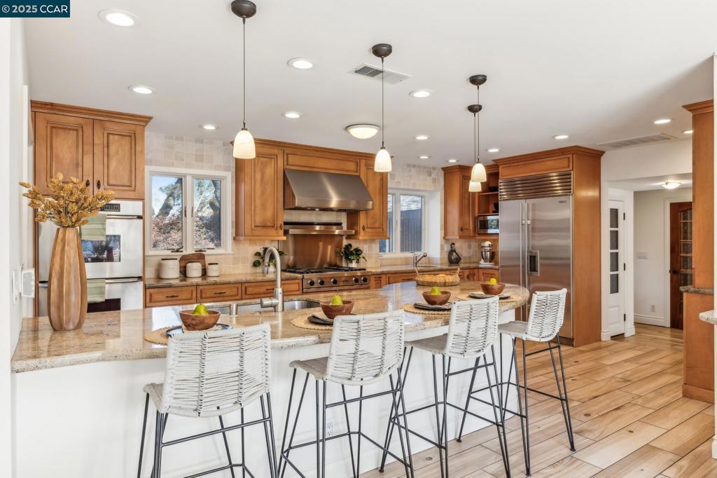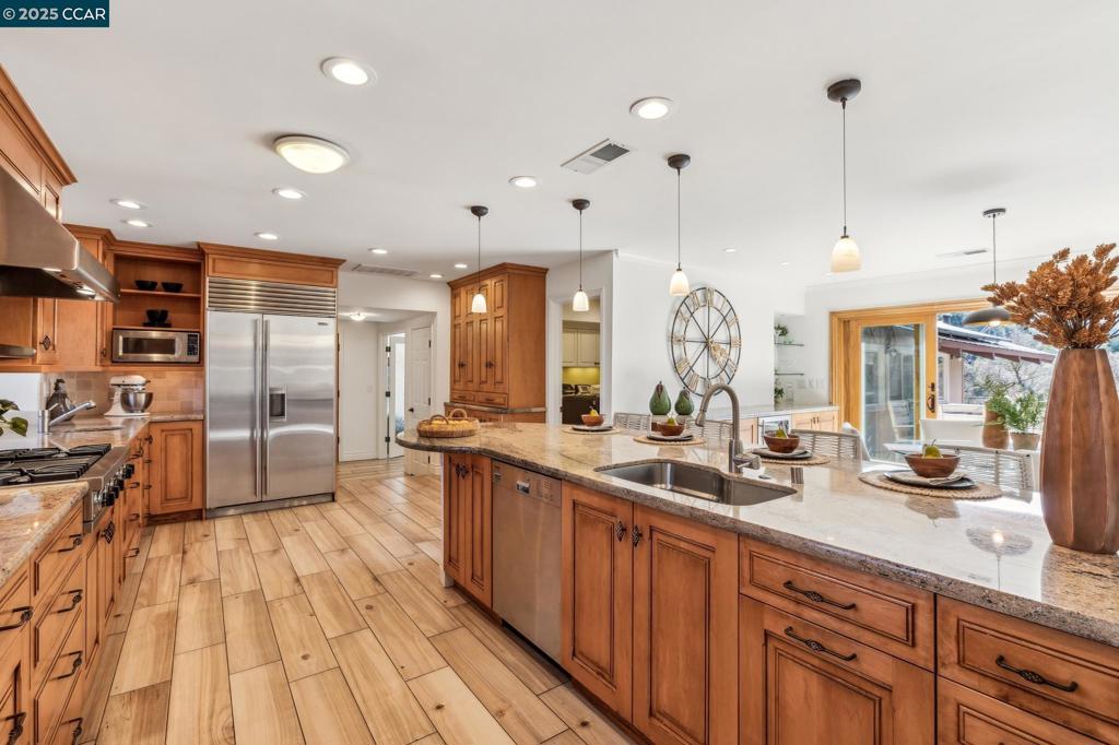 GREAT NEW PRICE! Perched above the treetops in sought-after Westside Alamo, this private hilltop retreat offers breathtaking views, unmatched serenity, and timeless California elegance. Set on nearly 2 acres, the main residence features 4 bedrooms, 3.5 baths, and over 3,200 square feet of sunlit living. The chef’s kitchen with premium appliances opens seamlessly to a view-filled dining room with fireplace—perfect for entertaining or quiet evenings in. A dramatic two-story primary suite creates a true sanctuary with its own living room, private deck, and panoramic vistas of Las Trampas Ridge. Three additional bedrooms, including a junior ensuite, are ideally positioned for privacy. The 1,300-bottle wine cellar, guest cottage with kitchenette and full bath, and resort-style pool complete the experience. Wood-look tile floors offer style and durability, while lush, oak-draped grounds bloom with year-round color. Just minutes from downtown Danville, Walnut Creek, top-rated schools and commute routes, this rare offering is a perfect blend of natural beauty and convenience. Come experience the view—and the lifestyle. Views: Ridge