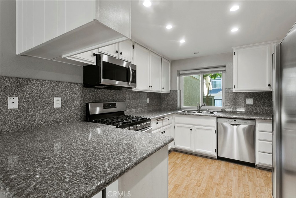This beautiful Townhouse is located in a pristine, private community in Lake Forest. The living room is comfortable and spacious with a homey, inviting fireplace. The entire home has fresh paint throughout, including cabinets, doors, fencing, and garage. Neutral laminate flooring downstairs. The kitchen is bright with granite counter tops and dining area. Large sliding glass doors from the living room and also the dining room leads to a spacious patio area. The fenced patio area is roomy, with a patio cover and plenty of space for outdoor patio furniture. The upstairs features two large bedrooms both with en suite bathrooms. The third bedroom was converted from a loft and includes an added closet, perfect for an office or bedroom for young children. The community offers access to pools, tennis court, and sport court area. Close to shopping, restaurants, and parks.