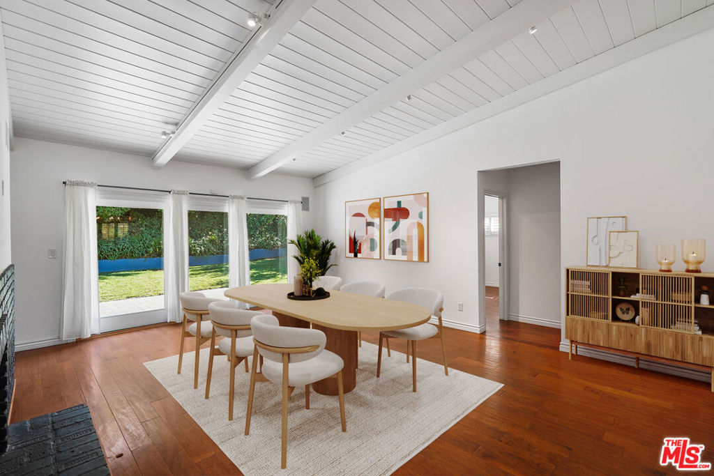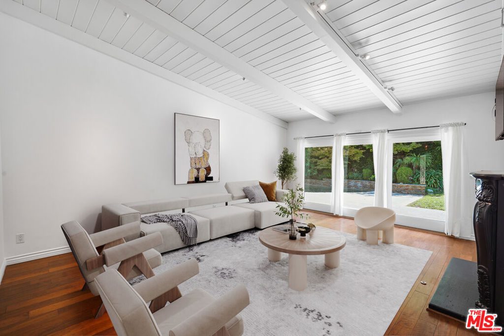 Spectacular Mid-Century Modern architectural with beautiful pool. Designed by Charles Du Bois, AIA, built in 1961. Situated on a quiet, tree-lined cul-de-sac in the coveted West Woodland Hills, this exquisitely remodeled, five-bedroom home blends mid-century architecture with modern, designer finishes, while retaining elements that make MCM special. Warm and welcoming from the moment of arrival, a stone motor court and entry path lead past lush, leafy landscaping to the covered, elegantly lit front patio. The front door opens to reveal the bright, airy interiors offering convenient single-story living, gorgeous hardwood floors, recessed lighting along newer sliding glass doors and windows. Vaulted, beamed ceilings soar above the open-plan living and dining rooms, dual glass chip gas fireplaces, and one custom mantle. The adjacent eat-in chefs kitchen boasts granite countertops, a spacious center island, picture windows, and custom cabinetry. Seamlessly fusing indoor and outdoor living, glass doors open to reveal the spectacular entertainers backyard, featuring a saltwater stone pool and elevated spa. Surrounded by mature trees and privacy hedges, the resort-like grounds boast a stone patio with ample space for alfresco dining and lounging, as well as a flat grass lawn and tree-shaded path ideal for play. Five beautiful bedrooms and three baths include the stunning primary suite with a huge soaking tub and seamless glass and steam shower with rain head. Additional features include brushed nickel and oil-rubbed hardware and fixtures, plantation shutters throughout, and a two-car garage. Private and serene, this 2,616 sqft on a 10,832 sqft lot home feels worlds away while located just moments from Woodland Hills top-rated schools, outdoor recreation, parks, shopping, dining, and 101 freeway access. It is also close to Bristol Farms, the Calabasas Farmers Market, shopping at The Commons, and The Village/Westfield Topanga. A move-in-ready opportunity for a stylish Charles Du Bois home.