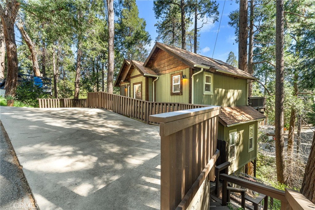 Welcome to this 3-bedroom, 2-bath mountain retreat featuring 1,274 sq ft of thoughtfully designed living space on a 6,920 sq ft lot. The home offers all bedrooms on the lower level for privacy and flow, while the main level is filled with natural light and designed for everyday living and entertaining. The spacious kitchen with pantry opens to the living area, which includes a fireplace, and provides direct access to the main-level deck, perfect for enjoying mountain views. A laundry room conveniently located on the main level adds practical functionality. The primary suite features a full bath and generous closet space, while the additional bedrooms share a well-appointed bath on the lower level. Outdoors, enjoy a lower deck, dog run, and garden area along the property line. Recent updates include fresh interior paint, repainted decks, and hardwood floors throughout. The flat driveway for easy access and parking. Situated minutes from Lake Gregory and local amenities including Goodwin’s Market and shops, this home combines mountain charm, functional living, and easy access to recreation and shopping.
