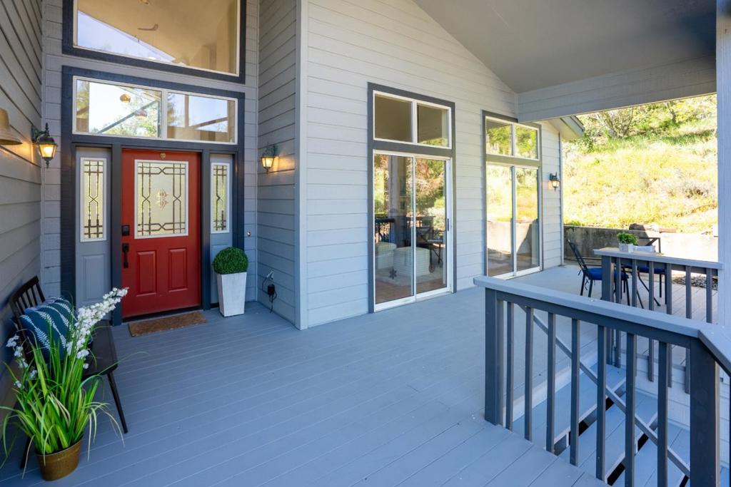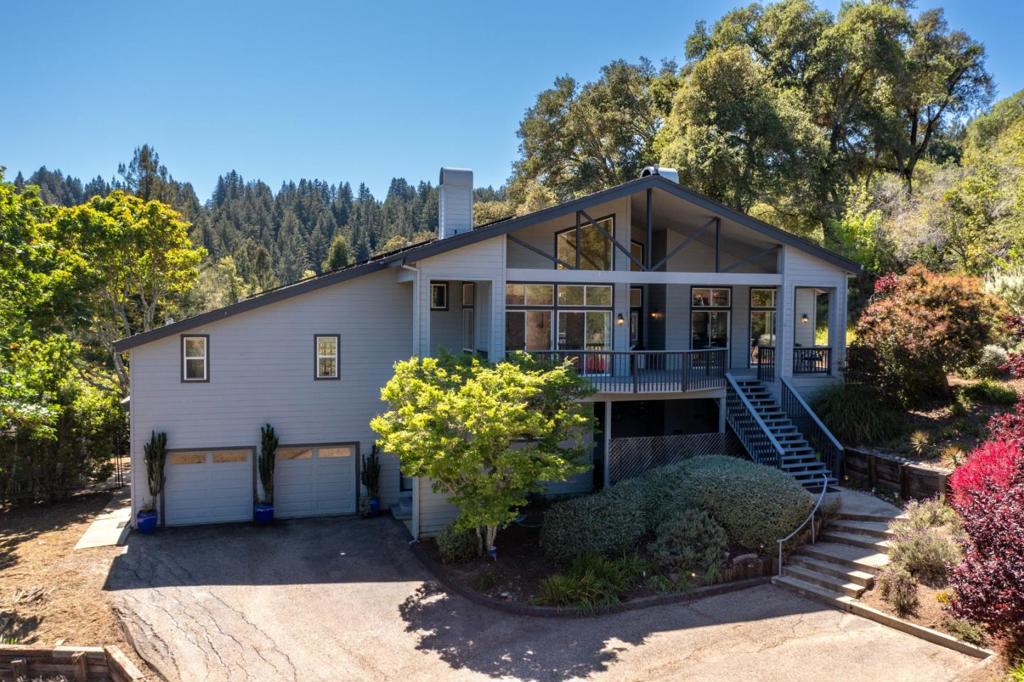 Contemporary mountain home with dramatic high ceilings, walls of windows, serene mountain & meadow views! Sunny usable acreage with colorful drought-resistant landscaping, grassy meadows, and magical redwood fairy rings! An abundance of space to add an ADU, horses, sport court, vineyard, or orchards. The 2-story home is an inverted floorplan with formal entry on the 2nd floor, featuring soaring ceilings and huge artsy chandeliers. Kitchen with granite tile counters, breakfast dining area, walk-in pantry. Formal living room with gas log fireplace, sliders to the front deck with meadow views. Separate family room with woodburning stove. Formal dining room. Kitchen and dining rooms both open to the sunny back deck with automatic awning, and hot tub. Steps down to an Endless Pools swim spa & sauna. The huge primary suite retreat features two 2-story high walk-in closets, spacious ensuite bathroom with oversized jetted tub, stall shower, and dual vanity, marble tile throughout. The lower level comprises two further beds & full bath, utility room, laundry/mud room, and access to the 2 car attached garage. Quality built in 1996 (post-earthquake) to more stringent engineering codes. New (owned) solar, powerwalls, & auto generator. Pool/garden shed, art studio/she-shed, and chicken coop.