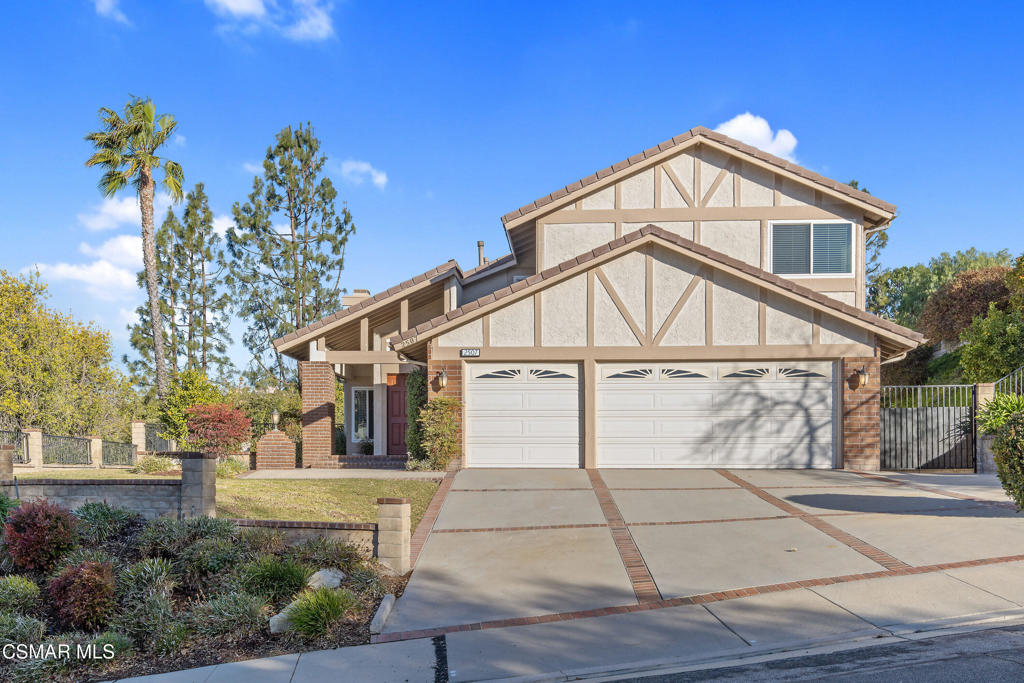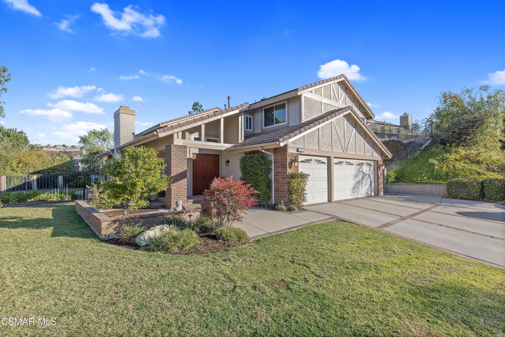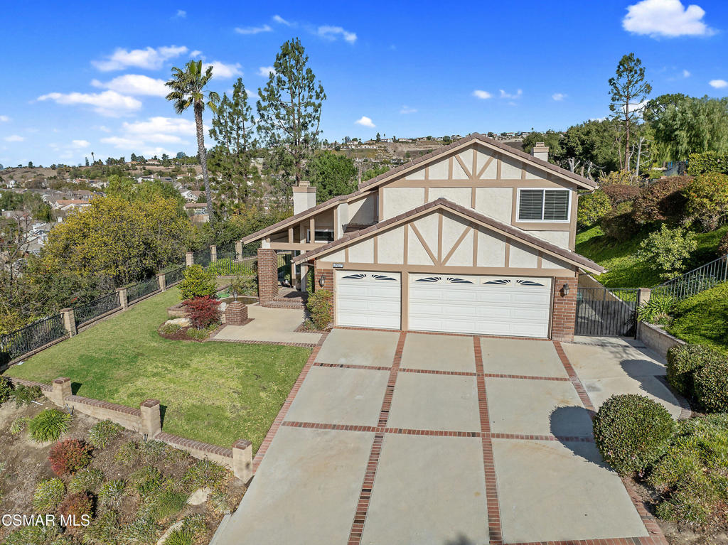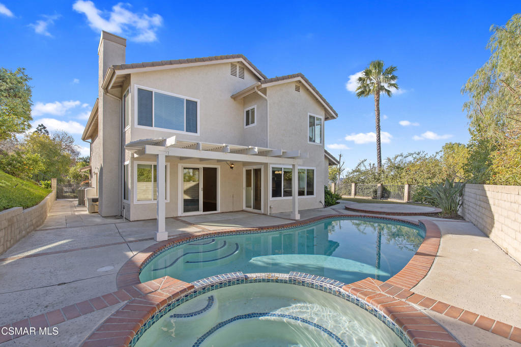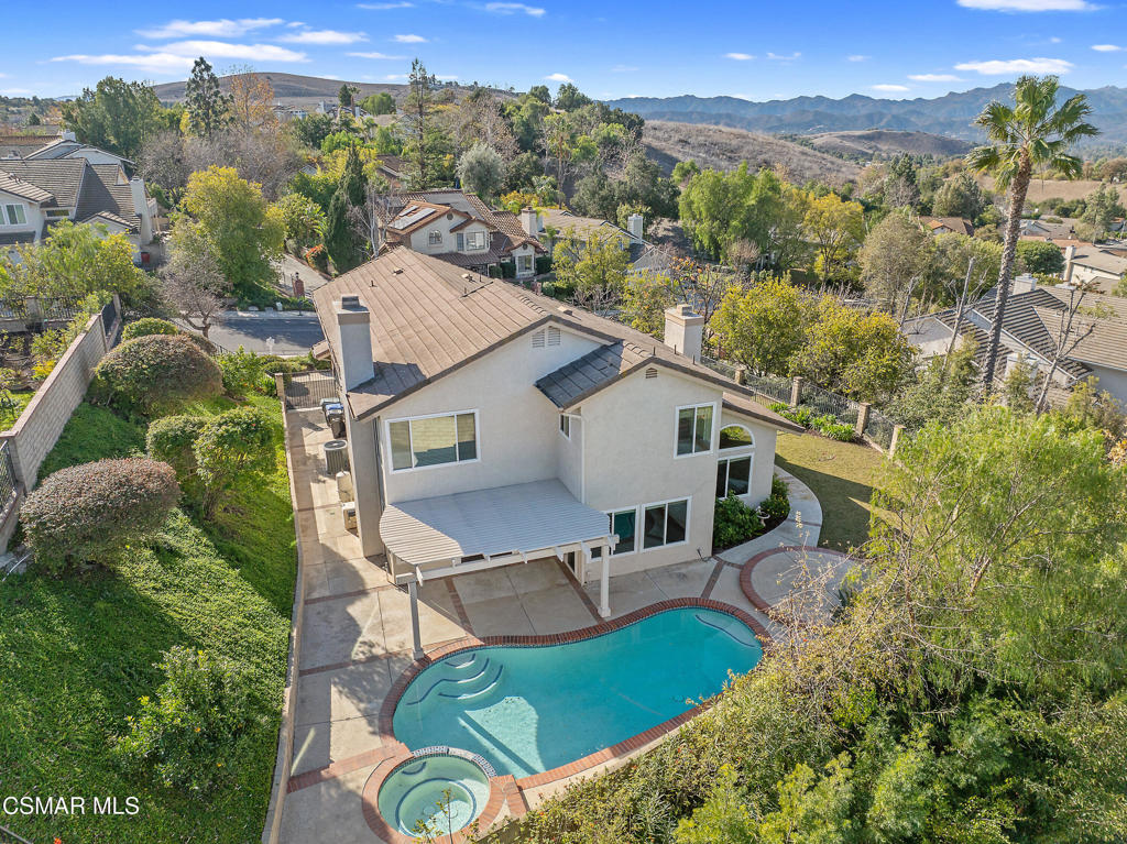 Located in the prestigious Brock Home Collection in Lang Ranch, this highly sought-after 2,728 SqFt home has 4 bedrooms + a large bonus room or optional 5th bedroom, 3 full bathrooms (1 bed/bath is located on the main level). The lot sits high above the property to its left creating privacy for the very large, flat front yard that wraps around to the backyard for ample outdoor yard space which includes thick mature grass, a pool & spa, and a patio overhang with dining space. Gorgeous mountain views can be seen from several upstairs windows. 3 car attached garage, indoor laundry room, central heating and air replaced in 2018 by Conejo Valley Heating & Air, a large open living room with high ceilings and a fireplace open to the formal dining room with views of the backyard. The dining room has direct access into the kitchen with a large eat-in kitchen area all overlooking the family room with a fireplace, wet-bar and 2 slider doors leading into the backyard for easy entertaining. The upstairs primary bedroom has high ceilings, ample sunlight, dual sinks plus a makeup area, walk-in closet, large soaking tub, separate walk-in shower, and a private toilet room. 2 more bedrooms and a very spacious bonus room (5th bedroom) upstairs along with a full bathroom. HOA is $170 Quarterly. Top-rated Lang Ranch school district. The area has shopping, freeways close by, fine dining, parks and more!
