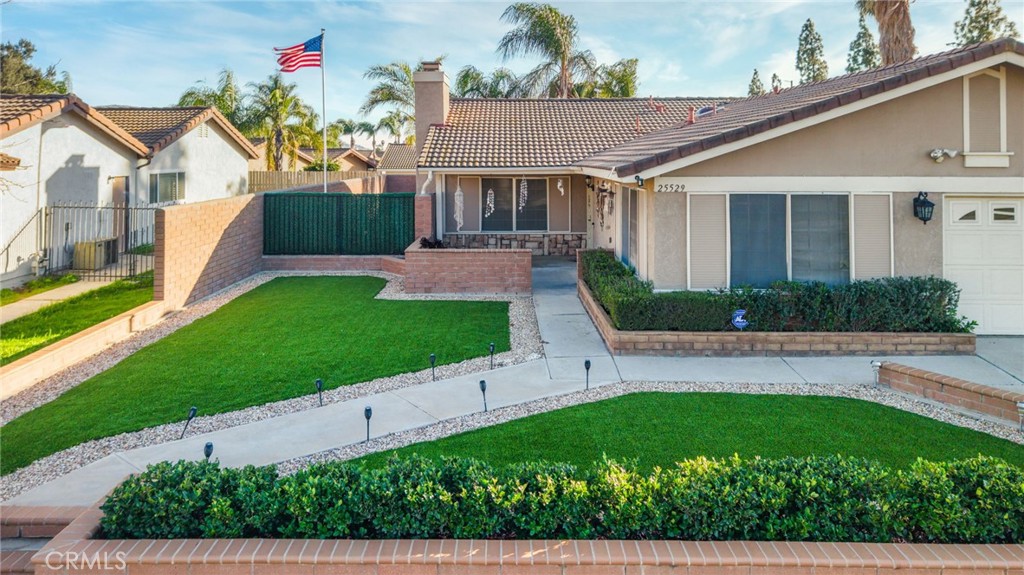 Welcome to 25529 Brodiaea Avenue, a beautifully maintained single-level home offering 4 bedrooms and 2 bathrooms in a desirable Moreno Valley neighborhood. From the moment you arrive, the stunning curb appeal sets the tone — gorgeous hardscape and rock details, newer sod, an elegant wrought iron fence with a privacy plant curtain, charming retaining walls with planters, and a cozy front porch perfect for slow morning coffee moments. There’s even extra parking for a third vehicle and an oversized side gate ideal for recreational toys. Step inside to an extra-large living room filled with natural light from oversized windows, complete with ceiling fans and a welcoming fireplace that anchors the space. The open kitchen features granite countertops, abundant cabinetry, and generous counter space — perfect for cooking and gathering — and flows effortlessly into a dining area with a built-in bookshelf/cabinet for added character and functionality. Toward the front of the home, you’ll find an oversized bedroom offering flexibility for guests, a home office, or multi-generational living. Down the hallway are two additional bedrooms and a full bathroom, along with an extra-large primary suite that serves as a private retreat, complete with dual sinks and its own en-suite bath. All bedrooms include ceiling fans, and tile flooring throughout the home provides easy maintenance and clean, seamless living. An indoor laundry room with cabinetry and an additional refrigerator adds everyday convenience. Step outside to your low-maintenance backyard oasis featuring artificial turf, retaining walls, large stepping slabs, and a spacious covered patio — the perfect setting for entertaining or peaceful outdoor relaxation. The included jacuzzi adds an extra special touch, making this backyard a true retreat. Recent upgrades include the air conditioning system, furnace, water heater, stove, and patio cover. The home is also equipped with solar that will be PAID OFF, a security camera system, and includes the washer, dryer, stove, microwave, and dishwasher. Conveniently located near parks, schools, shopping, and commuter routes, this move-in-ready home offers comfort, efficiency, and easy Southern California living in Moreno Valley.