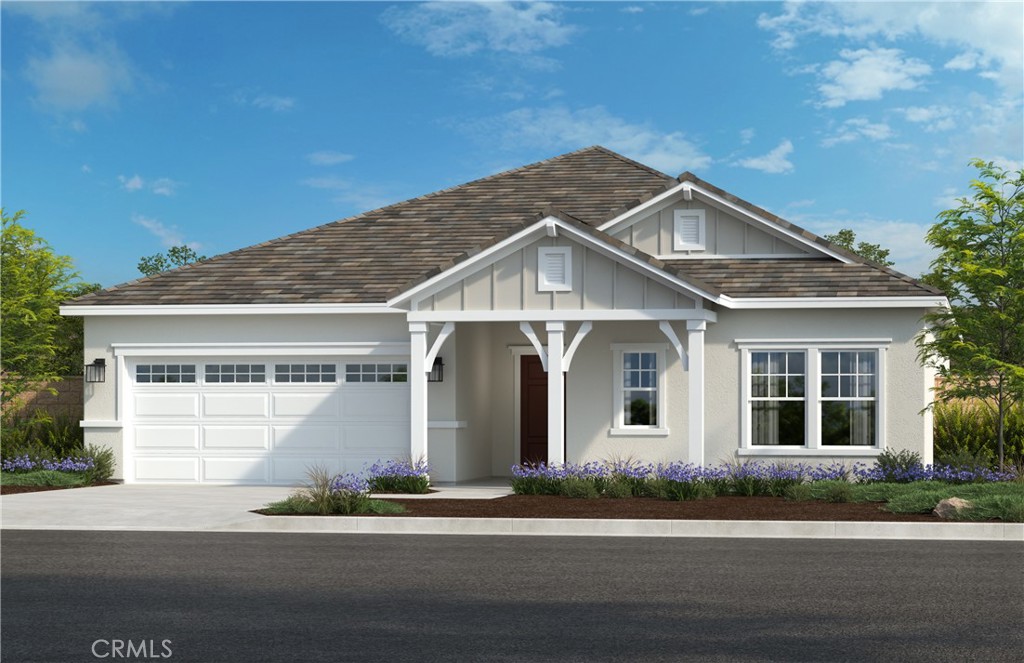 This stunning Farm style single-story home showcases water-efficient front yard planting for added curb appeal. Inside, discover an open floor plan with 9-ft. ceilings and luxury vinyl plank flooring throughout main living areas, including the flex room. The kitchen boasts white square raised panel thermofoil cabinets, quartz countertops and Whirlpool® stainless steel electric appliances. The primary bedroom features plush carpeting, a walk-in closet and connecting bath that offers cultured marble countertops, undermount sinks, a tub and separate shower. Enjoy the convenience of a dedicated laundry room with a sink. Additionally highlights of this all-electric home include LED lighting, a smart thermostat and solar energy system (option to purchase or lease required). Photo is a rendering of the model. Buyer can either lease or purchase the Solar.