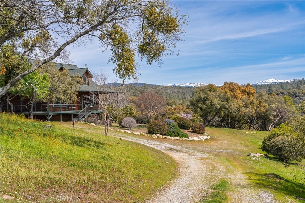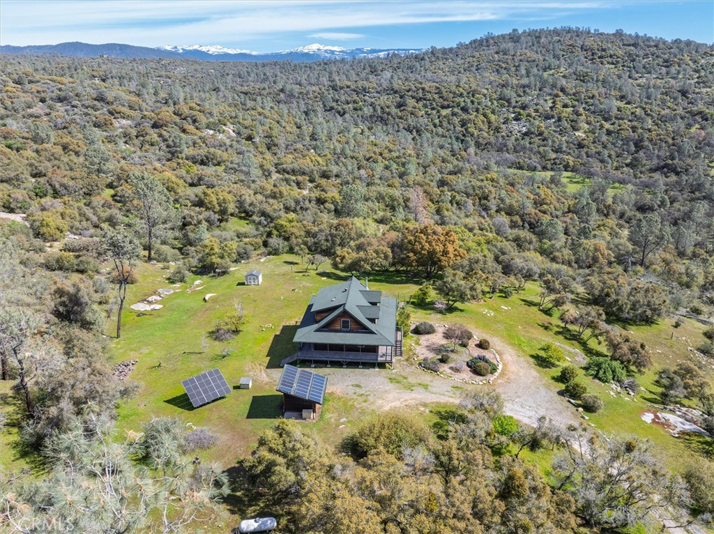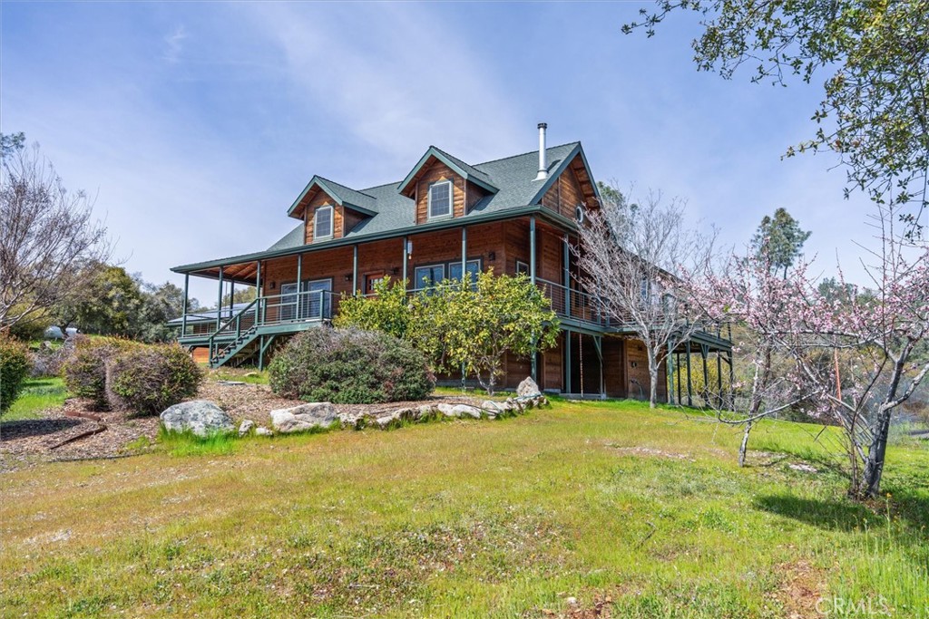 ESCAPE the hustle and come enjoy Country Living in this BEAUTIFUL Custom-Built Home tucked away on just over 40 Acres inside the prestigious Flying O Ranch Community in Coarsegold. Enjoy stunning views of the Sierra Mountains from the wrap-around deck and windows ** Stylish craftsmanship and design including an open concept kitchen, granite countertops, custom cabinets, and stainless-steel appliances, manufactured wood and tile floors throughout, lots of windows for cross-breeze and beauty, wood burning fireplace, ceiling fans, tankless water heater, and solar-tubes ** Primary Bedroom with ensuite is Downstairs, and the upstairs has a Second Bedroom with ensuite, and a Spacious Loft that has built-in cabinets used as a 3rd Bedroom & Office ** Top of the line SOLAR and Simpliphi 48 volt batteries are OWNED and in their own shed ** Whole House Kohler Generator included that automatically backs-up the batteries ** Surrounded by fencing to keep your kids and furry companions near & the land is flat and usable. Electricity and Water by the additional shed was used for horses ** But WAIT … This home comes MOSTLY FURNISHED and you will be SAVING MONEY because it’s FULLY OFF-GRID!! Additional Perks Include a seasonal creek; fruit trees including grapefruit, orange, lemon, peach, apricot, and beautiful seasonal blooming trees and flowers; HOA includes access to hike, bike, ride within the 1400 Acre community, and use of the clubhouse, pond, barn, and arenas. Come See it Today!