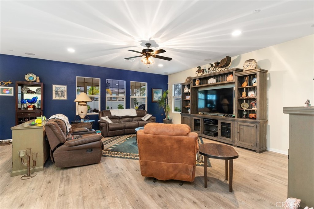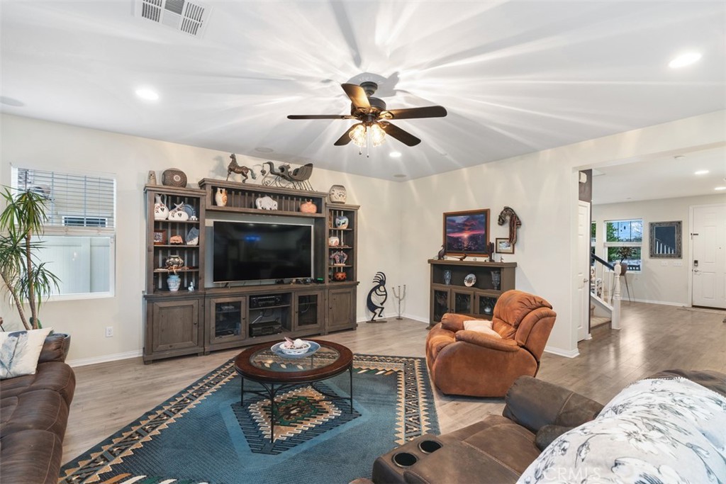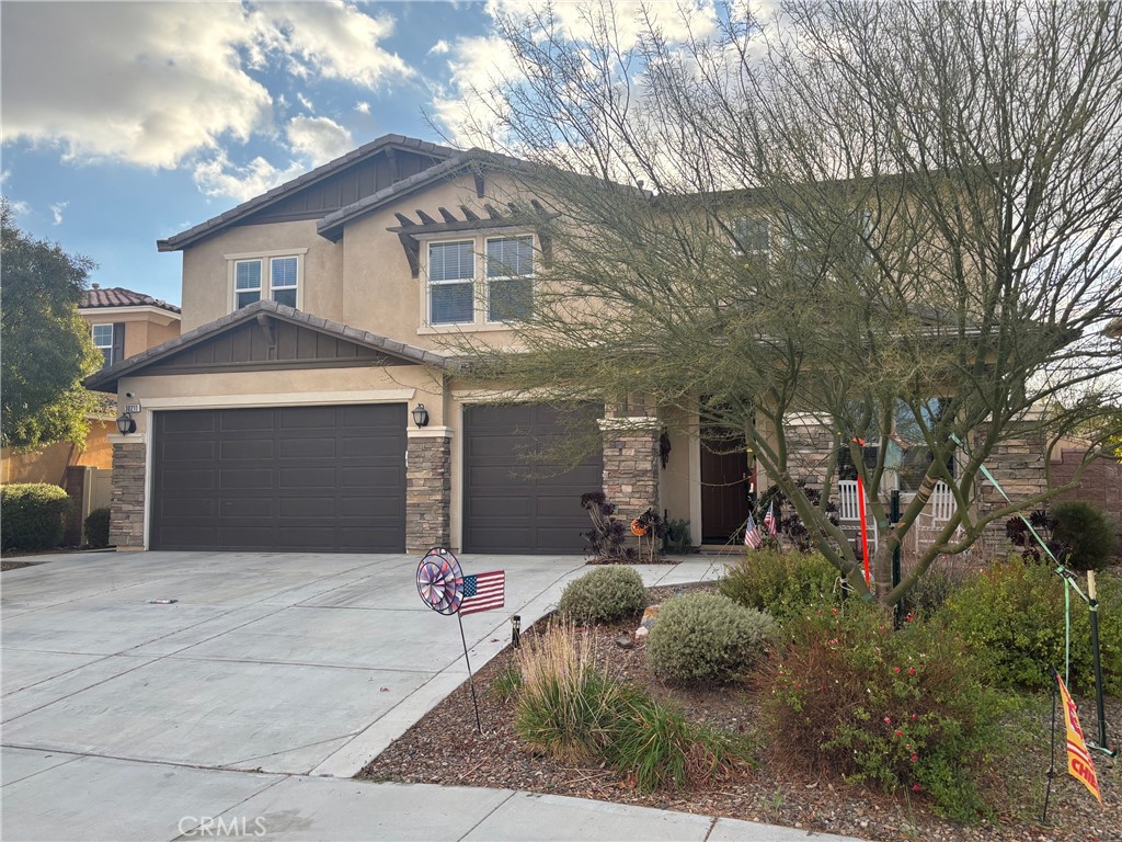 Welcome home to Mahogany Hills! This spacious family home features 4 bedrooms, a first floor office, upstairs loft and 3.5 bathrooms. A charming front porch welcomes you as you step into the living room. Wood-look flooring flows throughout the first floor. The expansive open floor plan expands into one large great room which is home to the family room, kitchen and dining area. Love to cook? When you see this kitchen, you’ll say, “Yes, Chef”. The kitchen has a large island with granite counter tops, full tile backsplash, specialty lighting, custom wine counter outfitted with two wine refrigerators, ample cabinetry, stainless appliances, and a walk in pantry with organizer. A downstairs office gets an A+ for utility with its custom wrap-around built-in desk with 4 workstations. A half bath is located off the hall. At the top of the stairs you’ll find the loft. The primary suite is incredibly spacious, allowing room for an additional sitting area, and has a custom built-in cabinet & drawer dresser. A serene primary bath boasts a spa-like feel, with its tile and finish details, dual sink vanity, large tub, and separate shower. Behold the primary walk-in closet! Beautifully outfitted with a custom built-in – Wow! Two additional bedrooms upstairs share a full bath off the hall and the fourth bedroom is an en-suite featuring its own bath with shower. The backyard has much to enjoy featuring a large patio with aluminum patio cover, lovely water fountain feature, private BBQ island w/ refrigerator, fire pit, garden planters and storage shed. The home is also energy efficient with two solar systems! Convenient location to schools, parks and shopping.