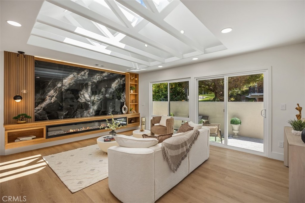 Experience unparalleled luxury in this impeccably remodeled, move-in-ready home that seamlessly blends sophistication with modern comfort. From the moment you step inside, you’re greeted by an abundance of natural light and breathtaking media/fireplace wall that creates an inviting and serene ambiance. The sunny patio serves as a versatile space, perfect for relaxation or entertaining guests. The home’s transformation includes a comprehensive renovation featuring central HVAC and a series of bespoke architectural enhancements. Notably, the living room boasts a stunning skylight and a custom wood and tile media surround, complemented by tailored lighting solutions. The residence exudes warmth and elegance throughout. The gourmet kitchen is a chef’s dream, equipped with custom cabinetry, quartz countertops, and top-of-the-line appliances and fixtures. A generous waterfall-style island provides ample counter space and serves as a central hub for social gatherings. Retreat to the luxurious master suite, thoughtfully designed en-suite bathroom features a spacious, custom-tiled shower and premium appointments, offering a spa-like experience. Additional highlights include abundant built-in storage solutions and a conveniently located stackable washer and dryer in the hall closet. Parking is easily accessible, adding to the home’s convenience. Residents of Laguna Woods Village enjoy access to an array of exceptional amenities, including golf, swimming, tennis, and a vibrant selection of clubs and social activities, all within a premier 55+ community. For a comprehensive view of this remarkable home, please click on the 360 Virtual Tours (VT) link.