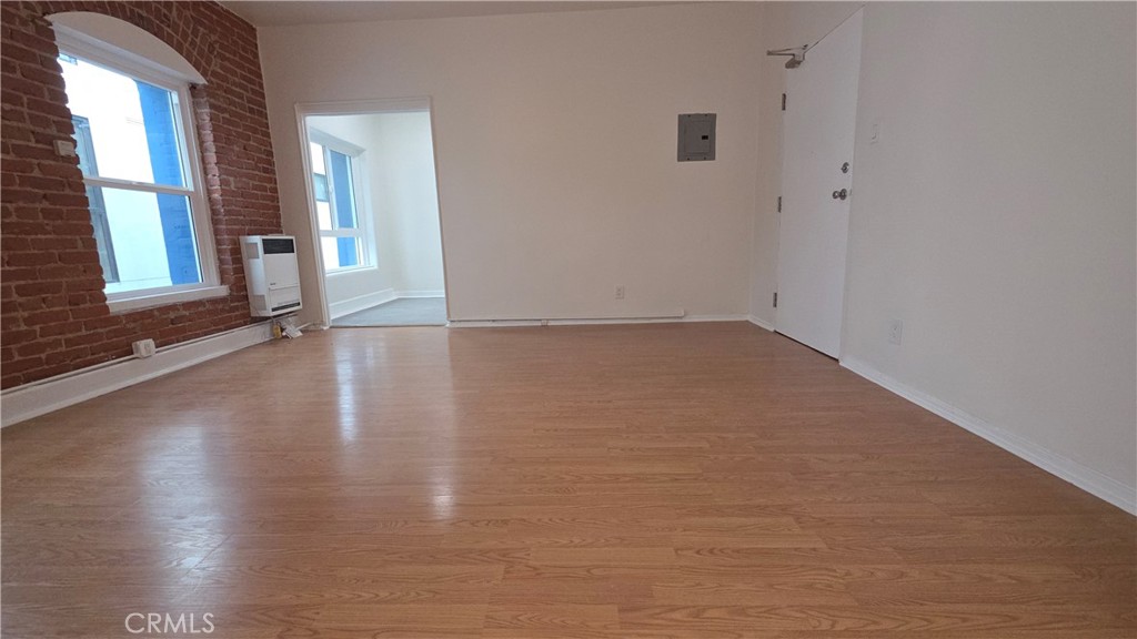 Bright, remodeled studio, exposed brick accent wall. Separate walk-in closet / dressing area that can double as a small office or storage room. Bright bathroom with classic black and white hex tile floor, tub/shower combo, and vanity with storage.