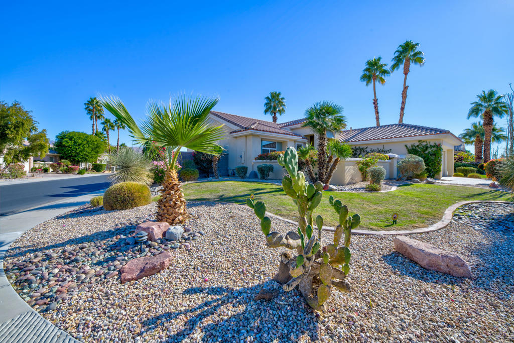 WOW! TURNKEY 55+ Sun City Palm Desert Morocco great room model 2/2 + office with custom built-ins. Located in the newer section of Del Webb on an expansive corner lot with gated courtyard with peak-a-boo mountain views, covered patio with in ground Pebble tech Jaccuzzi, water feature and built-in BBQ. Home is Newly furnished with King bedroom sets in both primary & guest bedrooms, the primary has double door entry, bay windows beautiful custom black-out window treatments. The primary bath has dual vanity sinks, a large step-in shower and walk-in closet. Guest bedroom is just off the guest bath with tub/shower combo. Chefs island kitchen has a dining/breakfast nook surrounded with windows. The extended 2 car garage has a golf cart niche’. Indoor laundry room has a utility sink and storage closet. Walk to Sunset View & Lake View Clubhouses, fitness center, restaurant-bar, pool, billiards, library, theater, card rooms and San Gorgonio 18 hole Golf Course and practice greens.