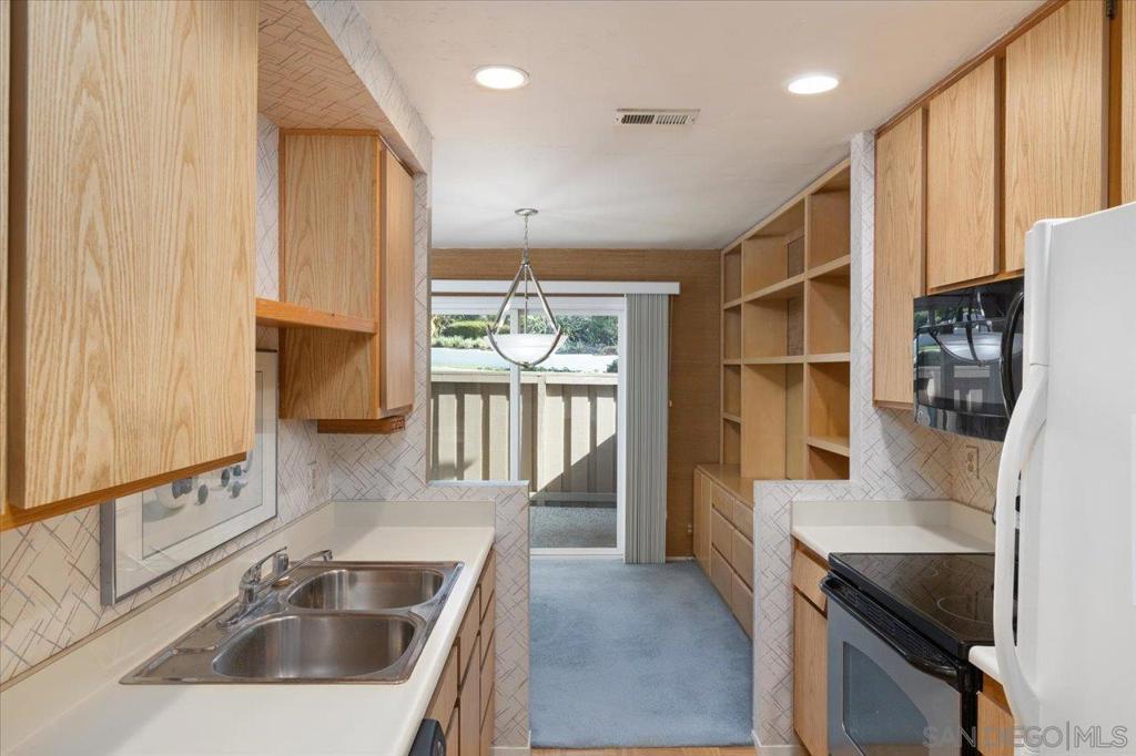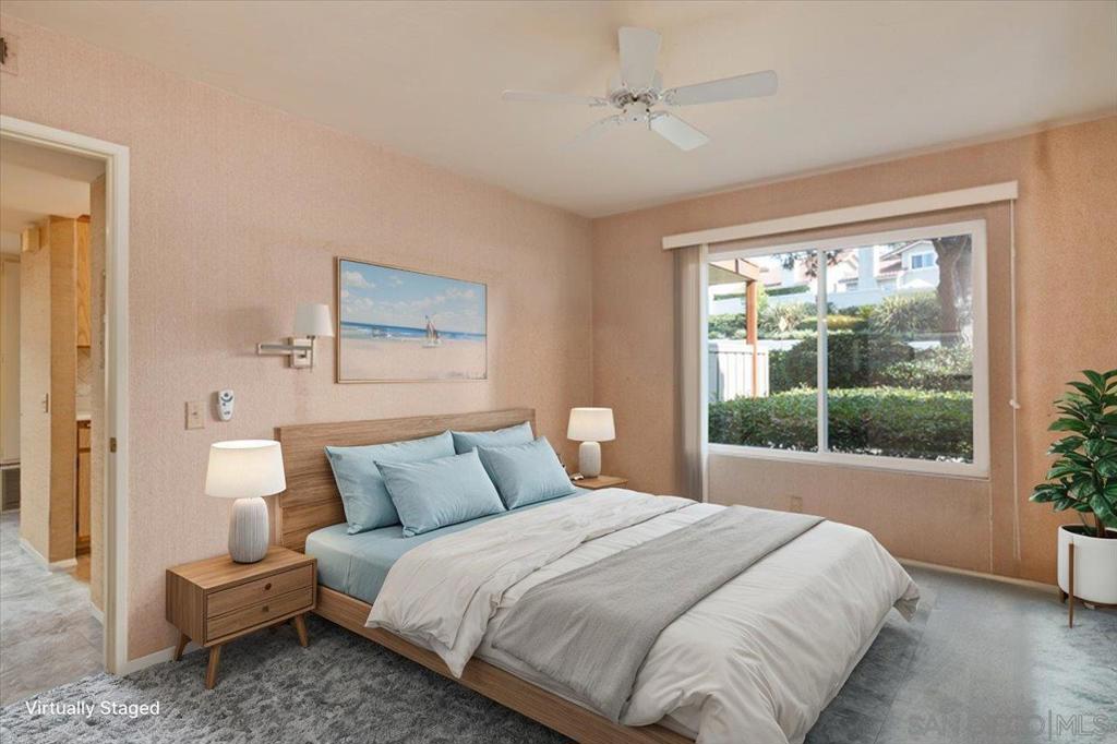 La Jolla Colony Charmer! Downstairs unit, no stairs. Private patio. Central Air Conditioning. Updates include new new windows and slider, blinds and water heater. Primary suite has a large walk-in closet with built-ins. Second bedroom is outfitted with a Murphy bed and good storage. There are two parking spaces under carport are super close. Fridge, washer and dryer are included. Complex features a nice community pool and spa.