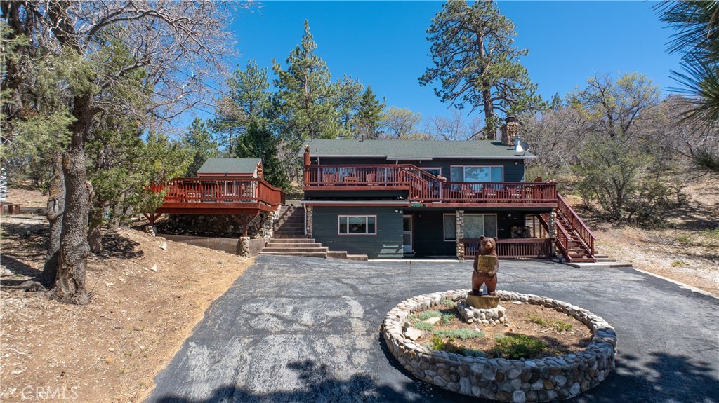 Escape to your private mountain retreat in Upper Moonridge, backing to acres of national forest with stunning ski slope views of Bear Mountain from nearly every room. This 4-bedroom, 3-bath home features vaulted ceilings, a striking river rock fireplace, and expansive windows that bring the outdoors in. The newly refinished deck captures breathtaking views, while multiple decks and patios create ideal spaces for outdoor living. Additional highlights include a hot tub-ready balcony and separate workshop. Just minutes to Bear Mountain, Big Bear Lake, and year-round recreation—this is the perfect blend of serenity and convenience.