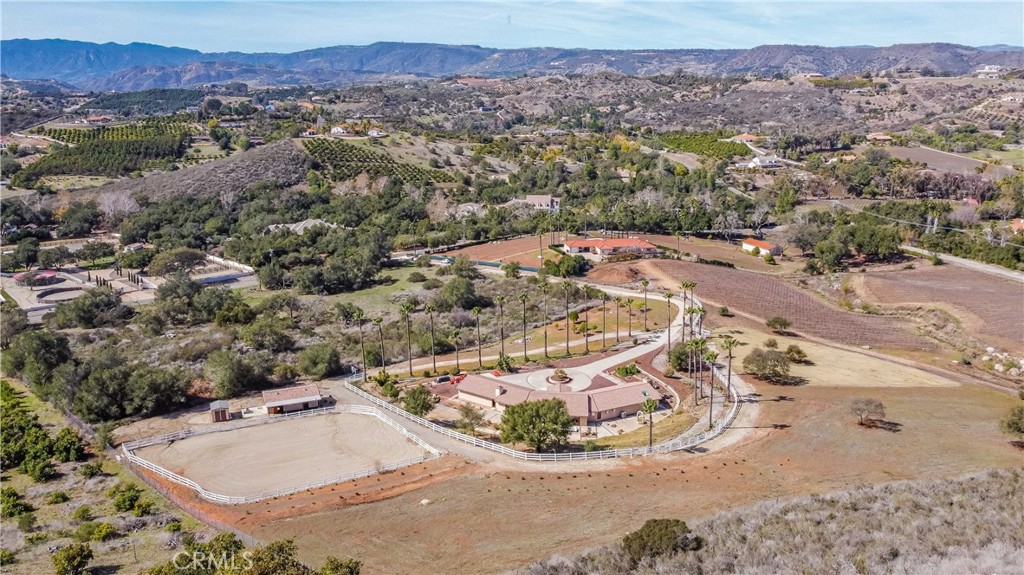 A private sanctuary nestled in the coveted DeLuz community, this breathtaking estate redefines country luxury with panoramic views, modern elegance, and unmatched tranquility. As you drive up the long, gated entrance, surrounded by lush greenery and fragrant citrus trees, a sense of serenity immediately sets in. The circular driveway welcomes you to this beautifully remodeled, single-story home, offering 3,000 square feet of thoughtfully designed living space. Step inside through the striking custom pivot Ogden door into a grand entryway featuring soaring arched wood ceilings, exquisite craftsmanship, and seamless indoor-outdoor living. At the heart of the home is an entertainer’s dream—a chef’s kitchen designed for culinary excellence, boasting dual ovens, a sleek induction cooktop, and an expansive marble island. Complementing this luxurious space, all cabinets throughout the home are custom-built, while every kitchen and bathroom counter and shower is adorned with elegant marble. The open living room, anchored by a cozy fireplace, exudes warmth and sophistication, while multiple French doors lead to patios, perfect for dining al fresco and soaking in the endless vistas. The primary suite is a retreat of its own, featuring a stone fireplace, a spa-inspired ensuite with a soaking tub, a walk-in shower, a private toilet room, dual vanities, and a spacious custom walk-in closet. Every detail has been meticulously curated, from the tall baseboards to the elegant luxury vinyl plank flooring and designer finishes. Generously sized guest bedrooms provide comfort and style, each offering picturesque views, plush carpeting, and ample privacy. A hallway lined with custom cabinetry offers abundant storage, while the oversized laundry room comes fully equipped. Outside, nature and luxury intertwine seamlessly. Gather around the fire pit on cool evenings or explore the property’s flourishing avocado, citrus, and pomegranate trees. Equestrian enthusiasts will appreciate the well-maintained stables with foam flooring, an outdoor supply room, and direct backyard access. An arena provides space for riding and training, while the surrounding landscape offers a perfect blend of natural beauty and functionality. An abundance of parking ensures effortless hosting for grand events. Located just minutes from Old Town Temecula, world-class wineries, and major freeways, this estate presents a rare opportunity to own a slice of paradise-where modern comfort meets timeless beauty.
