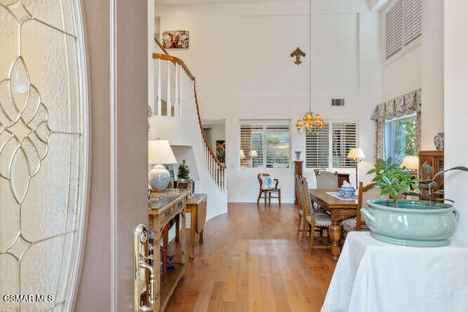 Fabulous location in Treasures of Dos Vientos Ranch. Classic elegance. Beautiful design. The peaceful location is near the top of the street with complete privacy and views of Boney Mountain. Step inside to high ceilings, beautiful wood floors, and white walls. Gorgeous Cook’s Kitchen was re-designed a few years back. Viking appliances, huge expanded island, and added cabinetry with coffee bar area and a workstation. this floor plan is an open 2,763 sq ft with 4 bedrooms, 3 baths and an additional bonus room/office/yoga room located downstairs. One bedroom/bath is located downstairs for guests. The laundry room is conveniently located upstairs.The pretty primary suite has views over the hilltops towards North Ranch. A new A/C was installed in 2023. There is lots of outdoor space with forever skies. The backyard will surely delight gardeners. Brick patios and planters, a huge side yard with green grass and Boney Mountain views. The property backs to natural parkland for complete privacyDos Vientos Ranch is a popular destination for homebuyers in Ventura County. Featuring miles of hiking & biking trails, numerous parks and ballfields, top-rated schools, your forever home is found here!