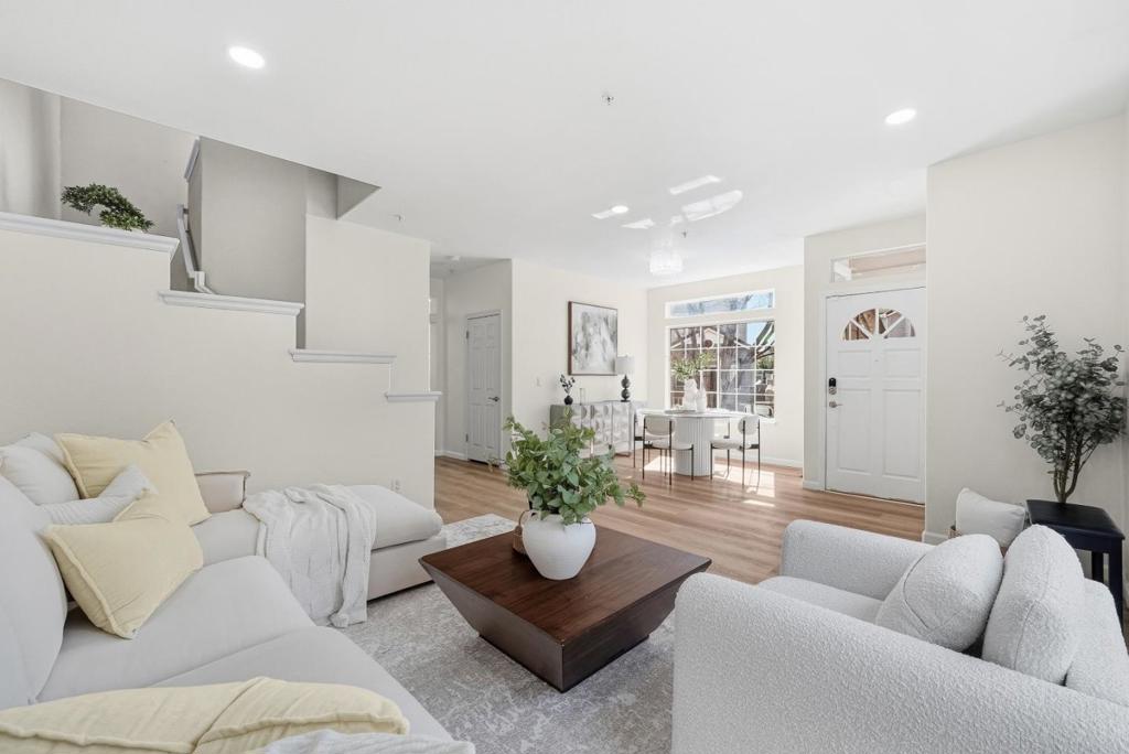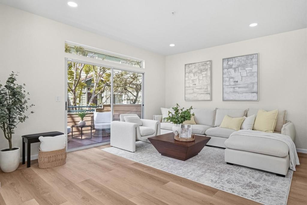 This spacious 3 bed, 2.5 bath end-unit townhome sits in a secluded cul-de-sac and lives like a single-family home. One of the most serene communities in Tasman Crossing, Traditions is surrounded by towering redwoods and lush greenery. The interior features fresh paint, new light fixtures, recessed lighting, hardwood floors, plush new carpet, and abundant natural light through large windows and sliding doors. The open living and dining area flows into a family room off the kitchen with a cozy fireplace. The gourmet eat-in kitchen offers stainless steel appliances and a breakfast bar. The oversized primary suite features a walk-in closet with custom shelving and an updated primary bath with modern finishes, including tub and separate shower. Spacious second and third bedrooms offer large closets, and a bonus room exclusive to Traditions is perfect for guests or a home office. Additional highlights include an attached two-car garage with Tesla charger, two private balconies, and a smart home system with smart lock, thermostat, EV charging, and Tesla-integrated garage door. HOA includes pool, spa, water, garbage, and earthquake insurance. Conveniently located near Seven Seas Park, VTA, grocery stores, major tech companies, and Highways 101, 237, and 85.