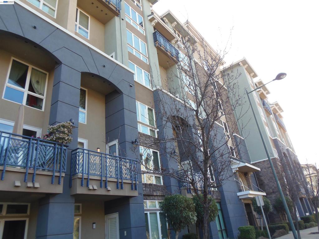 Perfect location! This 2bed/2bath condo is located on the 4th floor facing the garden and patio area. It is outside the enclosed hallway providing fresh air as opposed to being in the interior of the building. It features a larger floor plan and balcony than other 2 bedroom units. The cathedral ceilings in the living area provide an abundance of light. The loft on the second floor is an added bonus and perfect for a home office. The primary bedroom is on the second floor and a large second bedroom is on the first floor. Features include granite counters, laminate wood flooring on the first floor and carpeting upstairs. A washer and dryer is provided with the condo and is on the second floor. Other features of this Elan development include a fitness center, game room, gated 2 car tandem garage parking spaces, secured building access and parking and also guest parking. This location is a short block from BART. There is easy access to the 580/680 freeways, Whole Foods market, numerous restaurants, retail shops and Regal Cinemas movie theater. Your rent includes water and garbage. Available 3/27/26. Please note: this property requires a minimum credit score of 725 for everyone 18 years of age and older.