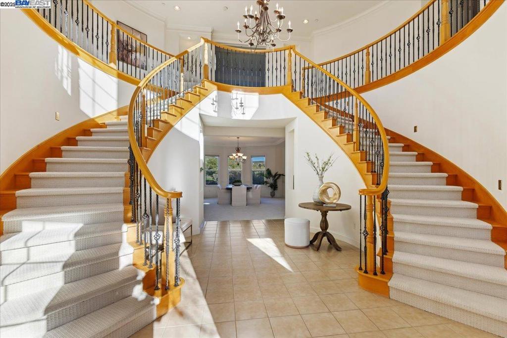 Toll Brothers largest San Marino floor plana within East Dublin’s gated Pinnacle Ridge! Boasting over 5800 sq ft of living space with 5 bedrooms plus office, 5.5 baths. Sweeping views on a corner lot and ultra-privacy. Dramatic two-story foyer with two spiral staircases, soaring ceilings and crown molding. Enjoy the main-level bedroom with an en-suite bath, an office which can be another downstairs bedroom. Chef’s kitchen appointed with center island, granite counters, beautiful cabinetry, GE Profile appliances, 6-burner cooktop, and walk-in pantry. Primary bedroom with spacious retreat and cozy fireplace. Feel pampered in your luxurious primary bath outfitted with 2 vanities, a jetted tub, a walk-in shower with dual shower heads, dual water closets, and a large walk-in closet. Bright and spacious secondary bedrooms with baths. A generous backyard, professionally landscaped, offers multiple venues for entertaining play and relaxation. Lush green hills and mature trees surround the expansive yard with golf course views. Close to shopping, dining, top-rated schools, freeway access, and BART!