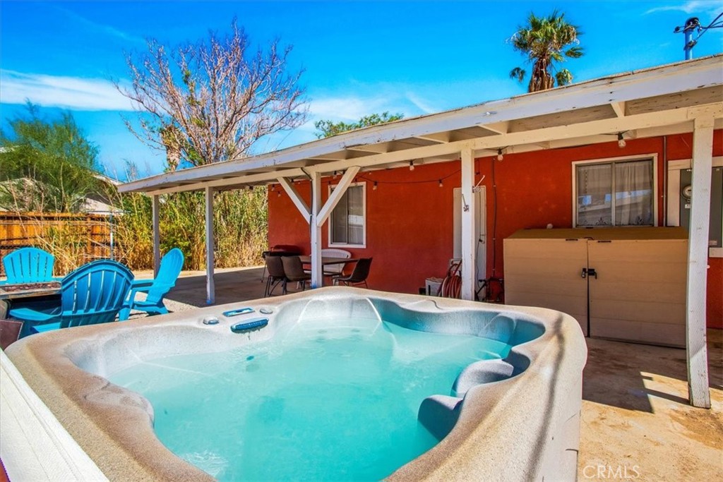 This home is turn-key and full of charm. This fully furnished 1-bedroom, 1-bath home is ready for you to move right in or start generating income. Offered fully furnished including a hot tub and all kitchen appliances, this home makes desert living effortless. Inside, the layout feels surprisingly spacious, featuring durable tile flooring throughout and a bathroom with a shower/tub combo plus a convenient linen closet. Home offers an energy-efficient mini-split heating and cooling system. Providing zoned climate control, allowing individual rooms to be independently heated or cooled for enhanced comfort and reduced energy costs. This ductless system offers quiet operation, improved efficiency. As you step outside and enjoy the beautiful wraparound covered patio, perfect for morning coffee or evening relaxation. The spacious backyard offers stunning mountain views, partial wood fencing for privacy along with chain-link fencing, and a covered shed housing the washer and dryer. A fire pit creates the perfect setting to stay warm while stargazing under the desert sky. Great for entertaining or relaxing solo. Ideally located the chocolate drop area, this home offers convenient access to the best of local amenities and desert living. Just minutes from downtown 29 Palms, enjoy nearby popular dining spots, coffee shops, breweries, and local favorites. Everyday conveniences such as grocery stores, banks, pharmacies, and gas stations are all close by along 29 Palms Highway. Outdoor enthusiasts will love the easy access to the north entrance of Joshua Tree National Park, as well as nearby parks, trails, and community recreation areas. The property is also near local schools, the public library, Theatre 29, and seasonal community events making it a great location for both full-time living, weekend escapes, or an investment property.