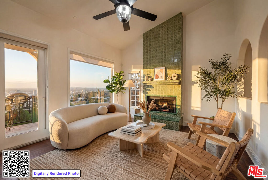 Welcome to a modern, Mediterranean style escape in the heart of the Hollywood Hills. The property is wonderfully complemented by city lights and verdant views out every window. Enter through the main level into a lovely foyer which leads to the living room, dining room, and kitchen, each adorned with architectural details including stylistic archways and vibrant tiles. Descend to the middle level where you’ll find the primary retreat, complete with sitting room, walk-in closet, and private terrace. Two additional bedrooms are also located on this floor, each with their own terrace, and a jack-and-jill bathroom between. On the lowest level is the family room, a large deck, a wraparound covered terrace, and the fourth bedroom. Stairs connect the outdoor areas on the lowest and middle floors. The home is complete with a two-car garage and driveway, surrounded by lush landscaping. It can also be accessed from Bryn Mawr Dr, with stairs leading up to the home from the street.