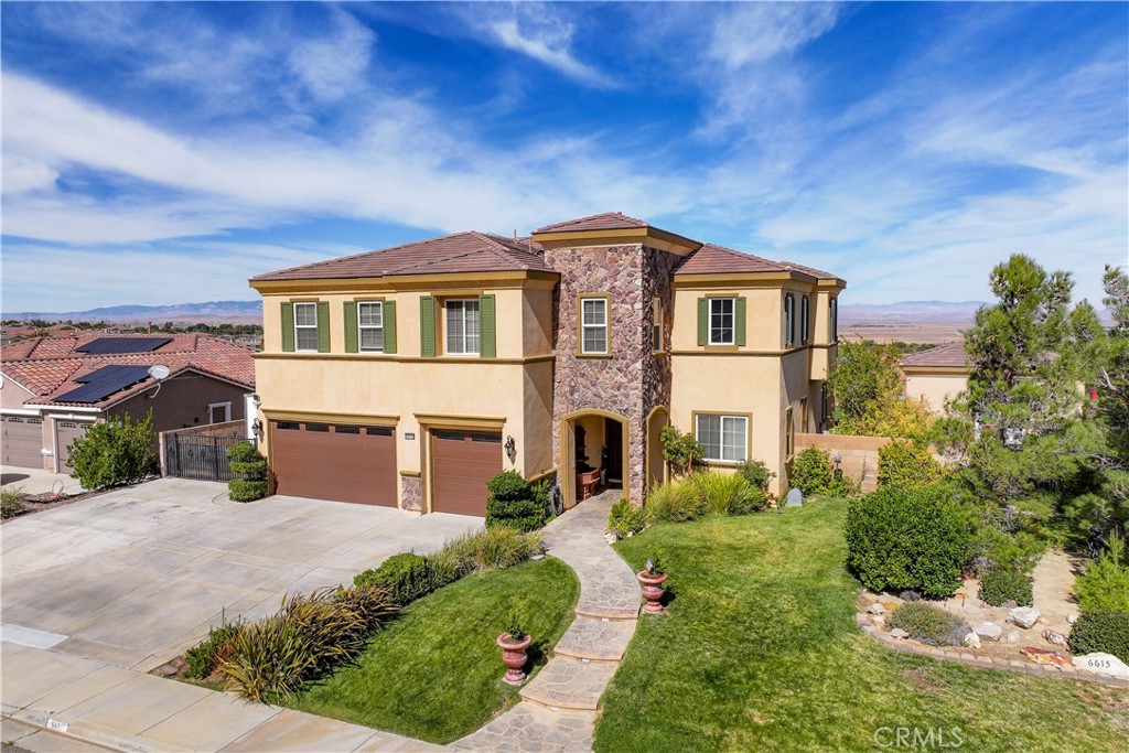 This one-of-a-kind former model home, offered by the original owner, sits in one of the Antelope Valley’s most desirable neighborhoods and is zoned for Quartz Hill High. Featuring 3,909 sq. ft. plus a 350 sq. ft. ADU, this home offers flexibility for multi-generational living or an income opportunity. Highlights include a butler’s pantry, formal living and dining rooms with soaring 25+ ft ceilings, and a secondary master suite downstairs with a full bath and walk-in closet. Upstairs, the primary suite opens to a walkout patio capturing stunning 300-degree views of the valley, Tehachapi range, and beyond. Enjoy a spacious game room with bar and library, a full outdoor kitchen, fireplace, fire ring, koi pond, and three large seating areas—perfect for entertaining. Energy-efficient with 5,500W of paid solar, dual tankless water heaters, two 5-ton A/C units, and 2×6 exterior walls. True RV access, block walls, and room for a pool complete this exceptional home.