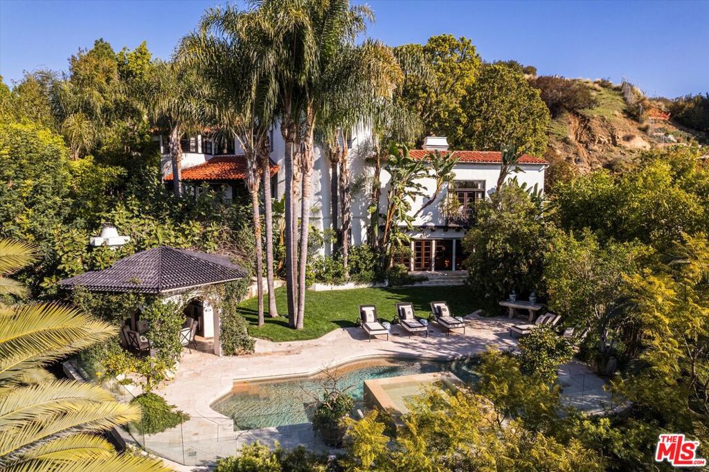 Located on a private and expansive lot with incredible views in the upper Outpost Estates lies this elegant and tastefully restored historic Spanish Estate. This one-of-a-kind residence boasts a lineage of impressive ownership; upon entering the front privacy gate, it’s clear to see what has attracted tastemakers to this property for nearly a century.The dramatic living room boasts high, chapel-like ceilings, excellent art walls, and a Juliette balcony that overlooks the city. On the main floor, you’ll find a spacious dining room with seating for up to fourteen, a recently remodeled chef’s kitchen featuring custom cabinetry, marble finishes, and premium Lacanche and Sub-Zero appliances. A breakfast room opens onto a balcony ideal for entertaining while enjoying city views.Descending the staircase, a soothing stone water feature guides you to a downstairs den and library, complete with custom bookshelves and doors that lead directly to the backyard. Outside, a lush, flat lawn surrounds a pool and spa, framed by mature palms that enhance privacy while maintaining views. An outdoor chef’s kitchen includes ample seating, a bar, built-in stone banquette with a firepit, and top-tier appliances by Viking and Miele.Upstairs, the primary suite offers two generous closets and an exquisitely crafted bathroom featuring imported stone, dual sinks, ironwork windows, and a soaking tub. A guest bedroom also on this level includes original tilework, two large closets, an ensuite bath, and unobstructed city views. The property’s unique turret provides additional flexible space ideal for a guest room, gym, or office, offering panoramic views from Downtown to the ocean.A fourth bedroom also with ensuite bath and separate entrance near the pool is perfect for guests. Meticulously landscaped grounds with mature trees and hedging complete this quintessential Old Hollywood estate. This residence uniquely blends privacy, prestige, elegance, and timeless charm a combination rarely available and impossible to replicate.