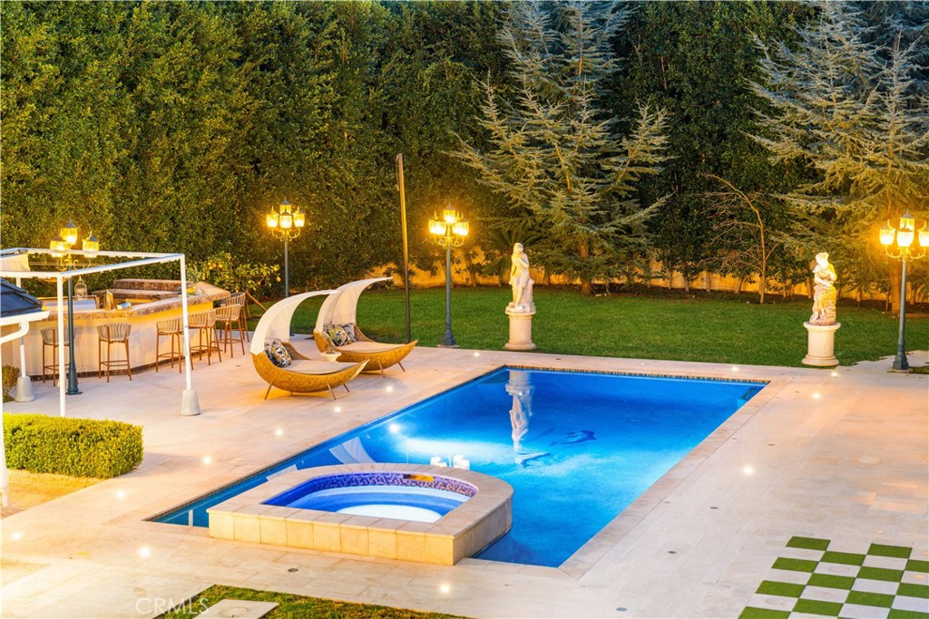 Situated on an expansive 0.43-acre lot, 701 Trenton Dr offers a two-story traditional residence with impressive curb appeal and a gated circular driveway accented by a fountain. The home features elegant living and dining rooms, along with a spacious family room with fireplace that opens through expansive glass doors to the private backyard, creating seamless indoor-outdoor living. The residence includes five bedrooms, with four located upstairs. The primary suite offers a sitting area, walk-in closets, and an oversized terrace with sweeping views toward Century City. Additional bedrooms are generously sized. The park-like backyard and yard space showcase mature landscaping, fruit trees, a resort-style pool, and a large BBQ area—ideal for entertaining, relaxing, and outdoor enjoyment. A chef’s kitchen with stainless steel appliances and breakfast area is complemented by a dedicated laundry and service wing, maid’s quarters, and a flexible bonus room. Additional features include a two-car garage and ample storage.