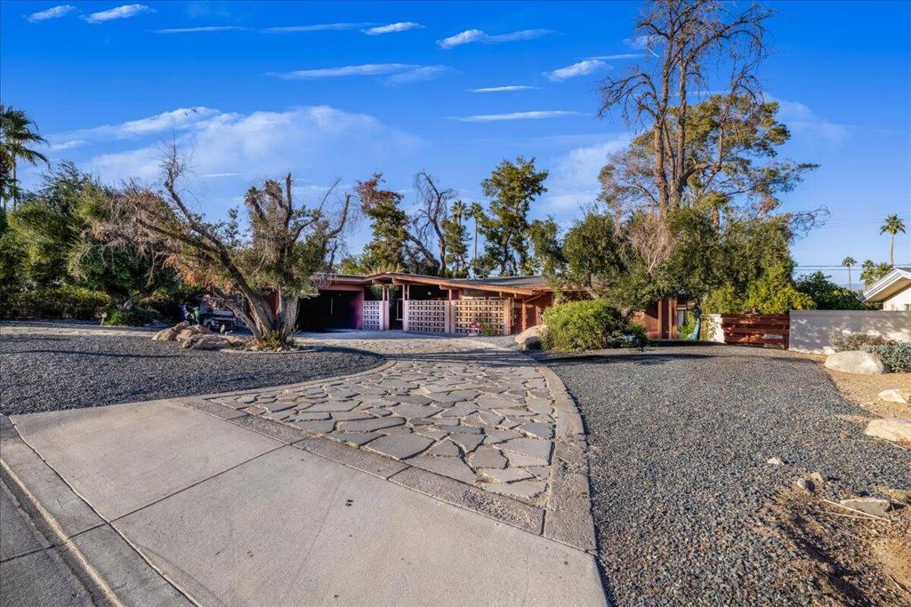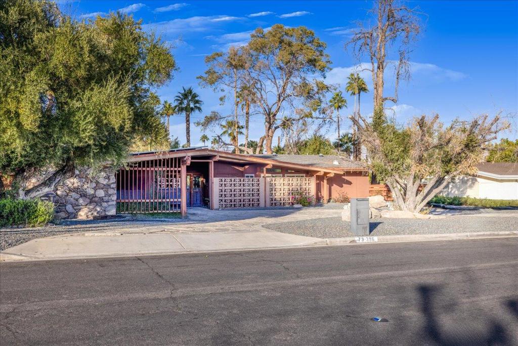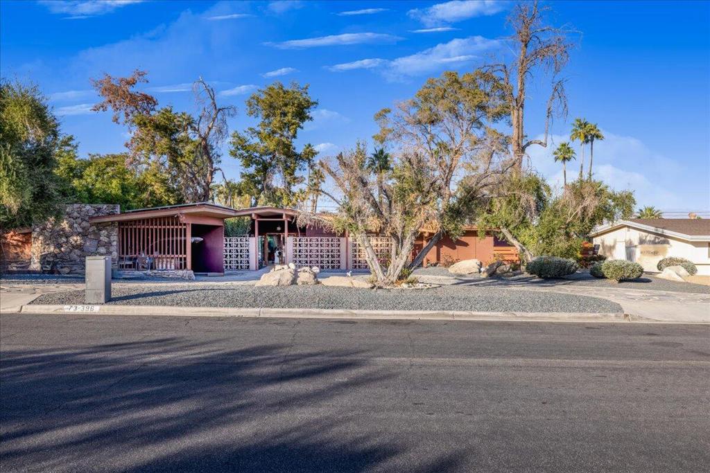 Discover a rare gem designed by renowned architect Charles Du Bois! This stunning 3-bedroom, 2-bathroom home is the perfect blend of postmodern and modern amenities. Large owned solar system & high ceilings as well as gorgeous mountain views greet you into this estate. In addition to its natural light, the AC is NEW installed in ’23 & pool pump ’24. This estate is located in George Washington Charter preferred zone, and is very private and brimming with pride of ownership including tube skylights throughout, just waiting for its new owner to put his or her own touch. The kitchen is a chef’s dream, offering stainless steel appliances, large counter space, and an impressive walk-in pantry for ultimate storage.The master bathroom provides a spa-like experience with a luxurious deep tub and concrete 5 star spa feeling. Expansive closet off master–ideal for unwinding at the end of the day and easy access outside. In the backyard enjoy the best of desert living in this low maintenance entertainer’s dream. Take a dip in the oversized sparkling and recently redone blue pool, which reaches an impressive depth of 9 feet, or gather around the BBQ and outdoor seating area for a perfect day or evening with friends and family.This property captures the essence of both luxury and comfort, offering a true quintessential S Palm Desert modern retreat that’s perfect for both relaxation & entertaining. Amazing investor opportunity and motivated seller. Bring all offers