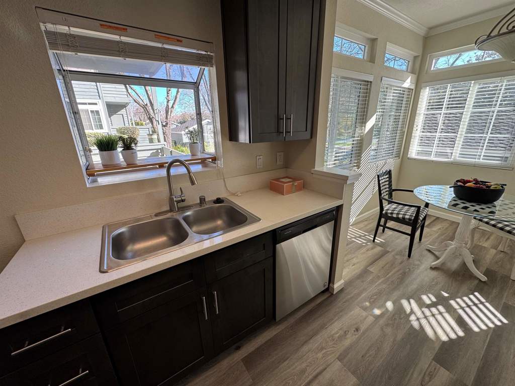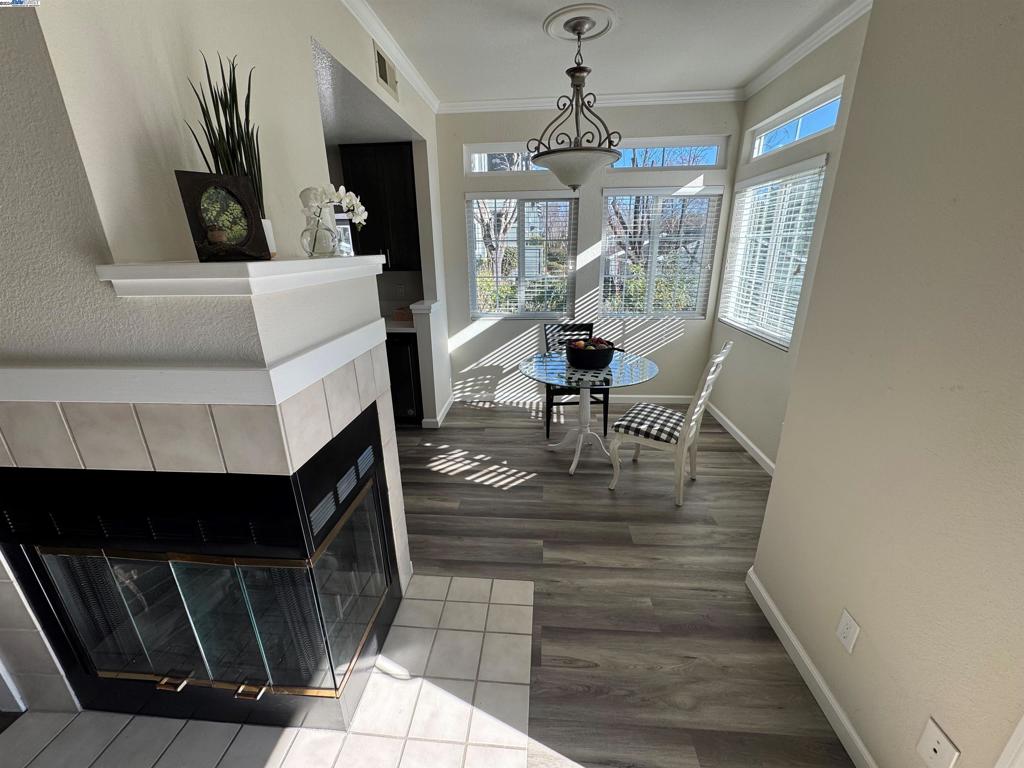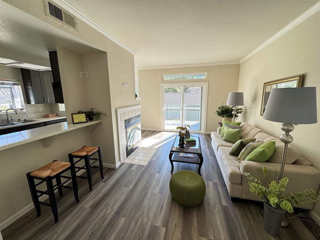Very sharp and clean unit. VA and FHA approved. Great location across from Clubhouse, pool, tennis court, gym, volleyball court, mail room. Furthest from freeway. First floor. LVP flooring (Vinyl hardwood look) and carpet in bedrooms. Shows well. 2 bedrooms, 2 full baths. Walk-in closet. Kitchen nook. Living room with fireplace. Two patios – one off living room; one off primary bedroom. Breakfast bar. Water and Heated Water! plus Trash included. Garage plus designated uncovered space.