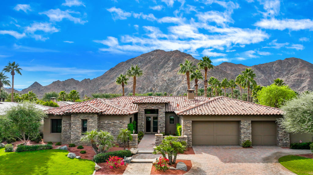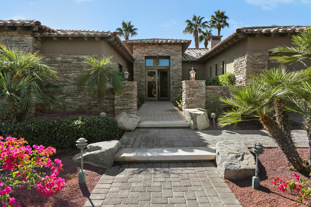 Welcome to this outstanding designer furnished, Tuscany inspired, semi-custom home built by renowned Ministrelli within exclusive Villaggio community at Indian Wells Country Club. Beautiful pavered driveway and walkways into courtyard entry of this gorgeous 3749 Sq. Ft. home, 4 bedrooms, 4 baths ensuite, plus Powder bath, home office, and 3 car garage. South facing home features new landscaping, large pebble tech pool/spa, mountain views, covered patio with built-in BBQ island, wonderful for entertaining! Open floor plan, high ceilings, Versailles pattern travertine floors throughout, stone baseboards and neutral carpets in bedrooms, Great Room and Dining Room. Great Room with pool and mountain views has built-in custom media center. Formal Dining has wet bar and serving area with granite countertops. Gourmet Kitchen has stainless Wolf appliances, Sub-zero refrigerator, 6 burners with grill stovetop, beautiful granite countertops and full backsplash, large island with bar seating and pantry. The Family Room adjoins the Kitchen with stonecast fireplace and custom built-ins. Private Primary Bedroom Suite features beautiful views, steps away from the sparkling pool/spa. Elegant Primary Bath has two walk-in closets, dual vanities, marble countertops, large glass shower, and jet tub.. Desert Living at its finest! Low HOA.