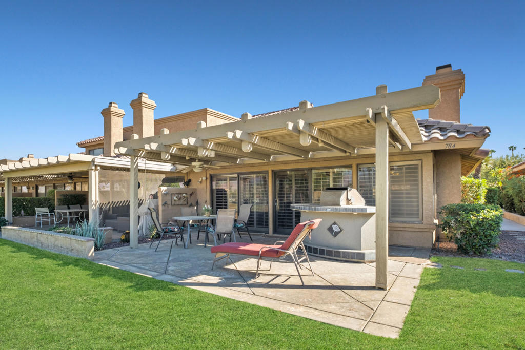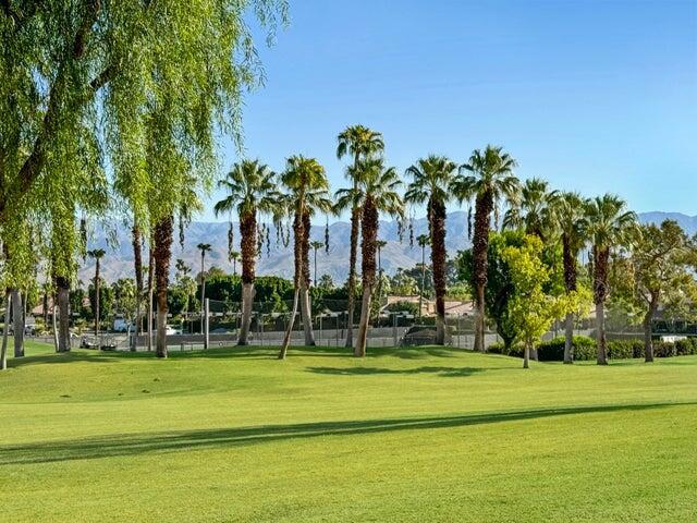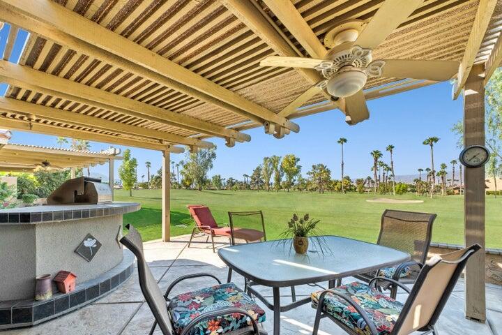 Location, Location! Golf Course Interior end unit on the 7th fairway. This Beauty is Ready Now for Rest and Relaxation! Enjoy the outdoors with a SPECTACULAR 180 degree view of mountains to the North and San Jacinto to the West from the patio. Gorgeous patio featuring a Custom BBQ Island, stamped concrete patio, providing an ideal setting for al fresco dining, entertaining. Inside you will enjoy a remodeled kitchen. Well maintained single level interior with open plan living and dining, 2 bedrooms, 2 baths, and attached garage. A/C and water heater have been replaced. Woodhaven Golf course where pay-to-play. Enjoy access to a challenging 18-hole golf course, 4 community pools/spas, tennis & pickle ball courts, fitness center, dining, pro shop, banquet facilities, card/game room & manned security at the main gate. HOA amenities include cable TV, Wi Fi & internet. Close to the Indian Wells Tennis Garden, 10 freeway, coffee shop, restaurants and grocery stores.