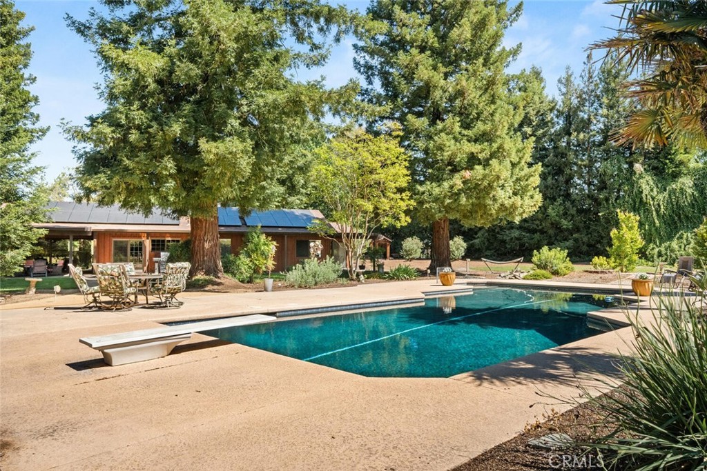 Bring the toys, the hobbies, and the pool floats—this 1.5-acre property offers OWNED SOLAR, a HUGE POOL with diving board, and a 1,000 SQFT DETACHED SHOP is a must see! Set at the end of a cul-de-sac, this spacious 2,508 sq ft 4-bedroom, 2-bath home offers the perfect blend of comfort, space, and privacy. Inside, the open floor plan features tall, beamed ceilings, recessed lighting, and a blend of hardwood and tile flooring throughout—hardwood in the living and family rooms, with tile throughout the rest of the home. The upgraded kitchen includes granite countertops, a center island with breakfast bar, and flows seamlessly into the living room with a dramatic beamed ceiling and large sliding glass door providing backyard access. A spacious separate family room or bonus room with coffered ceilings offers additional living or entertaining space. Down the hall are three guest bedrooms and a beautifully updated guest bath with granite countertops, tiled walk-in shower, and classic clawfoot tub. The primary suite features patio access, a large walk-in closet, and an updated bath with dual vanity, granite countertops, and walk-in shower. Step outside to a tranquil backyard oasis, featuring mature trees, expansive green space, and beautifully landscaped grounds. The expansive pool doubles as a lap pool and features a diving board, offering a refreshing escape from the Chico heat. Plenty of room remains for 4-H projects, a garden, or even a future pickleball court. Double gates on both sides of the property allow easy trailer or RV access, while the 1,000 sq ft detached shop—complete with a half loft for significant additional storage—provides versatile space for hobbies, storage, or a dedicated workshop, plus a large shed for storing mowers and garden equipment. Come see the potential of this versatile property today!