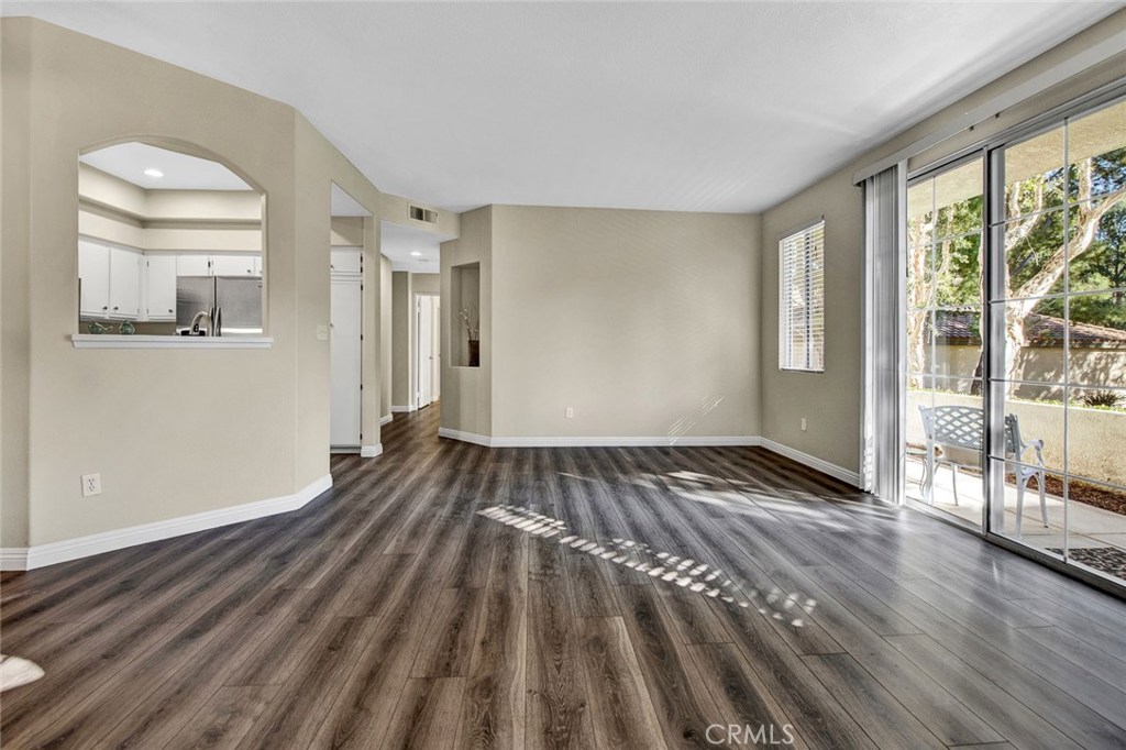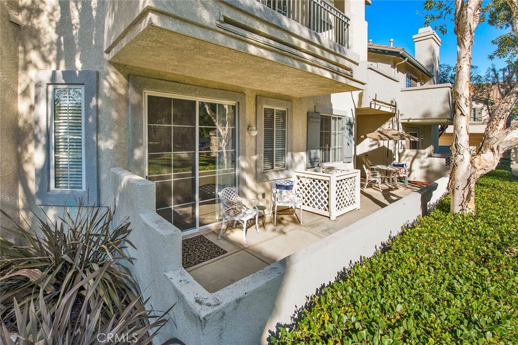 Desirable ground-floor end unit featuring 2 bedrooms and 2 bathrooms, located in the beautiful gated community of Viewpointe North. This popular floor plan offers an open living space and a large private patio extending from the living room to the primary bedroom. The inviting living room features laminate flooring, a cozy fireplace, and a large sliding glass door providing abundant natural light and direct patio access. The adjacent dining area includes an updated chandelier, creating an ideal space for entertaining. The remodeled kitchen showcases quartz countertops, white cabinetry, recessed lighting, stainless steel sink and faucet, and stainless steel appliances, including a refrigerator. Down the hall are two bedrooms, a guest bathroom, and a convenient indoor laundry closet. The spacious primary bedroom offers laminate flooring and a large sliding glass door leading to the private patio. The updated primary bathroom features a walk-in shower, dual-sink vanity, recessed lighting, and a walk-in closet. The guest bedroom includes laminate flooring, mirrored closet doors, and a peaceful greenbelt view. The guest bathroom offers a bathtub/shower combination. Additional highlights include a one-car attached garage with direct access and one designated covered carport nearby. Viewpointe North amenities include two pools, five spas, a clubhouse, and dual gated entries.