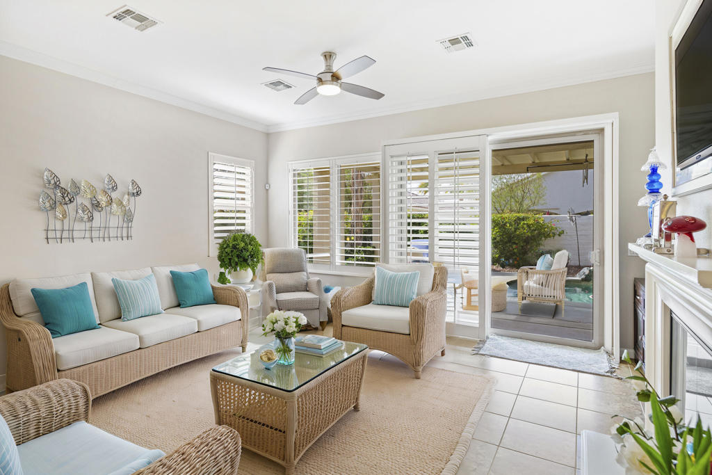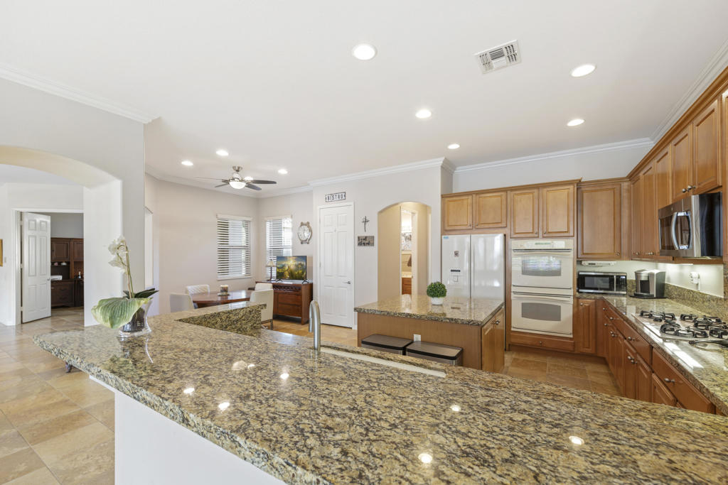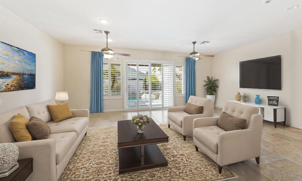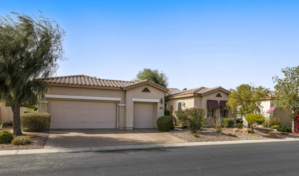 Beautifully upgraded San Miguel 2 bedrooms and a den/office, 2.1/2 baths, guest area/guest house that is attached and can be accessed from inside or outside, formal and informal areas, upgraded tile floors, granite counters, crown molding, large gourmet kitchen with eating area. Large spacious rooms, oversized custom walk in closet, extra large laundry room, ceiling fans, high ceilings, low maintenance landscaping, attached 2 car plus golf cart garage, redone custom driveway and walkway, everything you could want in a new home, large private backyard with salt water pool and spa for your enjoyment. This home has been lovingly maintained by it’s current owner. It features so many upgrades, it must be seen to be appreciated. It also features a quiet interior location. Sun City Shadow Hills is a 55 plus community and has many amenities for your enjoyment a 18 hole championship golf course, putting course, fitness centers and various dining options, this gated community has it all, come see the life style you can enjoy.