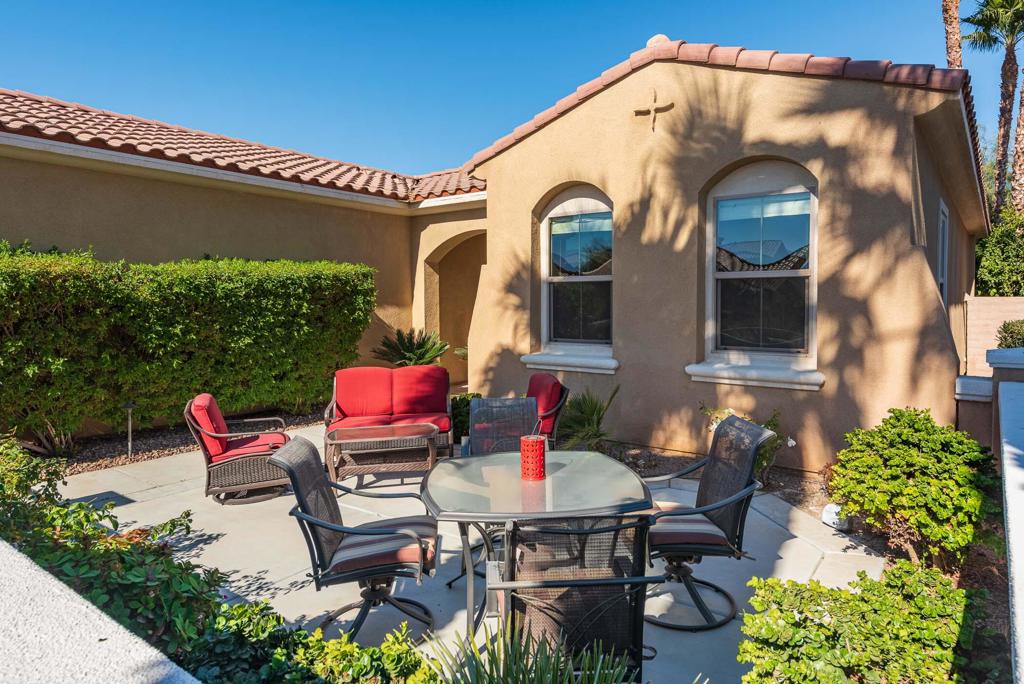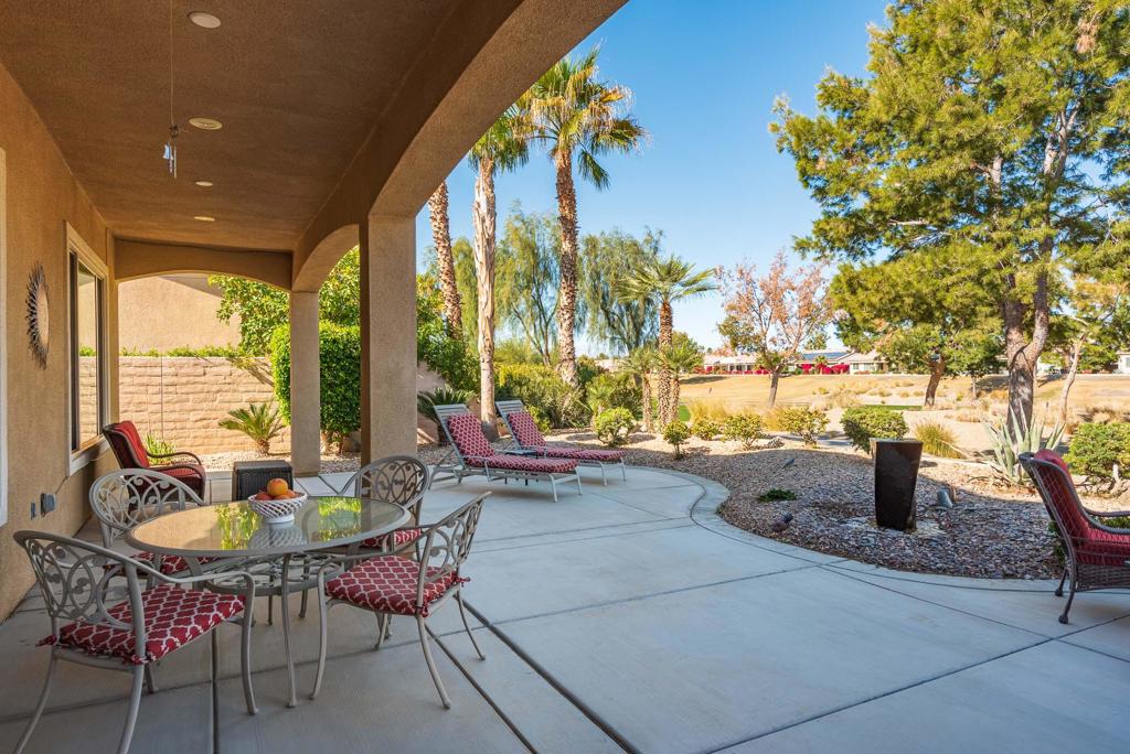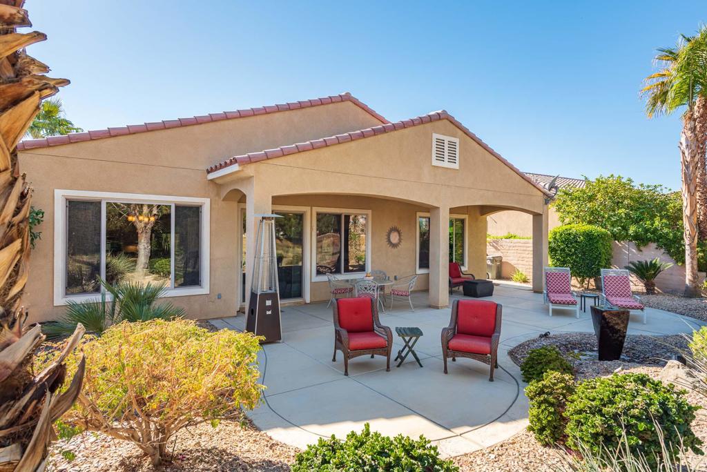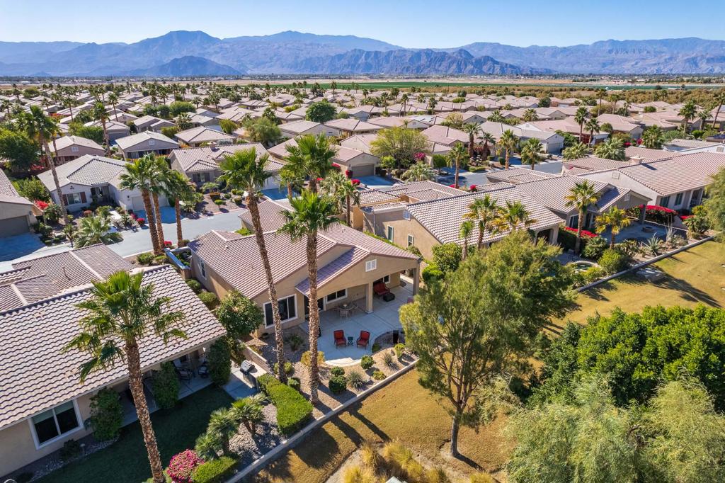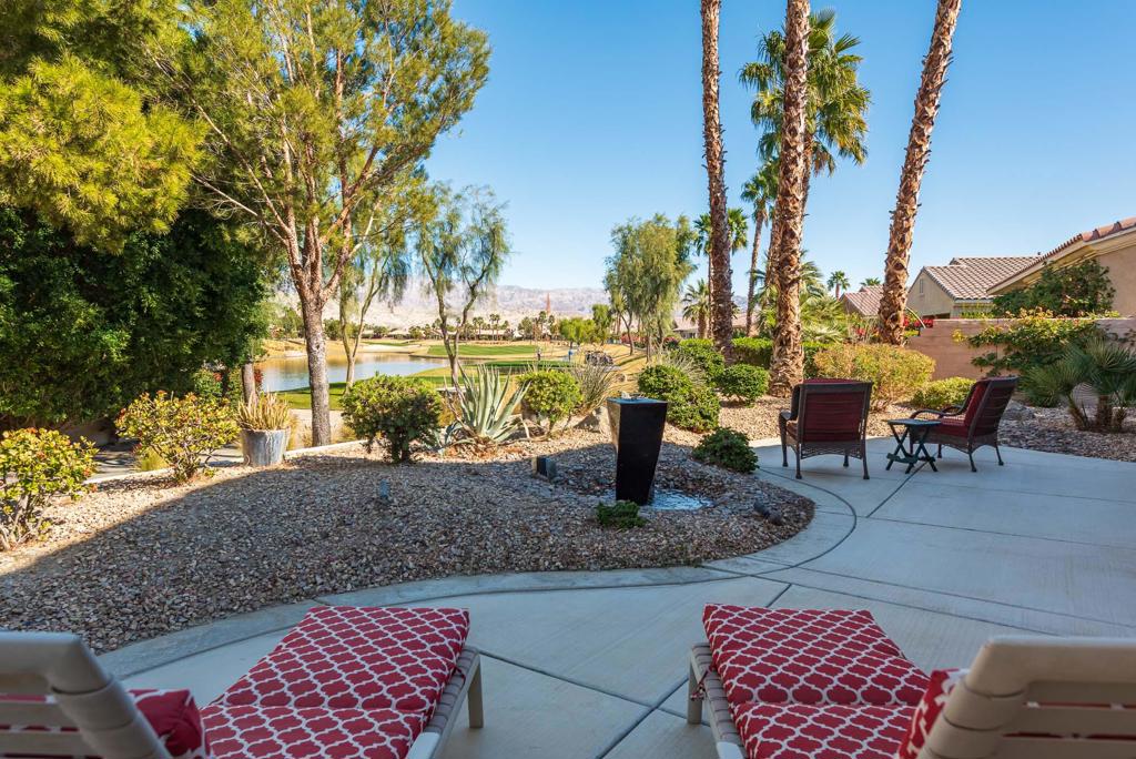 NEW PRICE!!! VIEWS in every direction. Watch the golfers putt out at the 3rd green of the championship course from your expanded back patio. Catch those purple and pink shadows on the mountains in the afternoon and see the gorgeous sunsets behind Mt. San Jacinto. Your background ”music” is the trickling water from the elegant, rock fountain. This home has many updates and upgrades including a recent HVAC system, a front courtyard, a phantom screen door, custom window treatments, custom cove lighting and specimen plantings to enhance the ambiance of this beautiful yard both front and back. Granite slab counters, wood cabinets and stainless steel appliances are found in this entertainers’ kitchen. The wrap-around breakfast bar can seat 6 easily. 2BR, 2Bths a den/3BR plus laundry room. TURN-KEY FURNISHINGS: TVs, cookware, dishes, linens are all included with a well-maintained GOLF CART! There’s like-new neutral carpet in the bedrooms with Italian porcelain tile in all the hallways, baths and kitchen. An easy, care, elegant and comfortable home for desert-resort living! Add to this the amenities of living in Sun City Shadow Hills such as 2 clubhouses, 2 fitness centers, tennis, pickle ball, basketball, bocce ball, snack bars, a full-service restaurant, events, clubs and TWO GOLF COURSES (LOW fees for owners & tenants) for very LOW MONTHLY HOA DUES. Doesn’t get better for this NEW price!